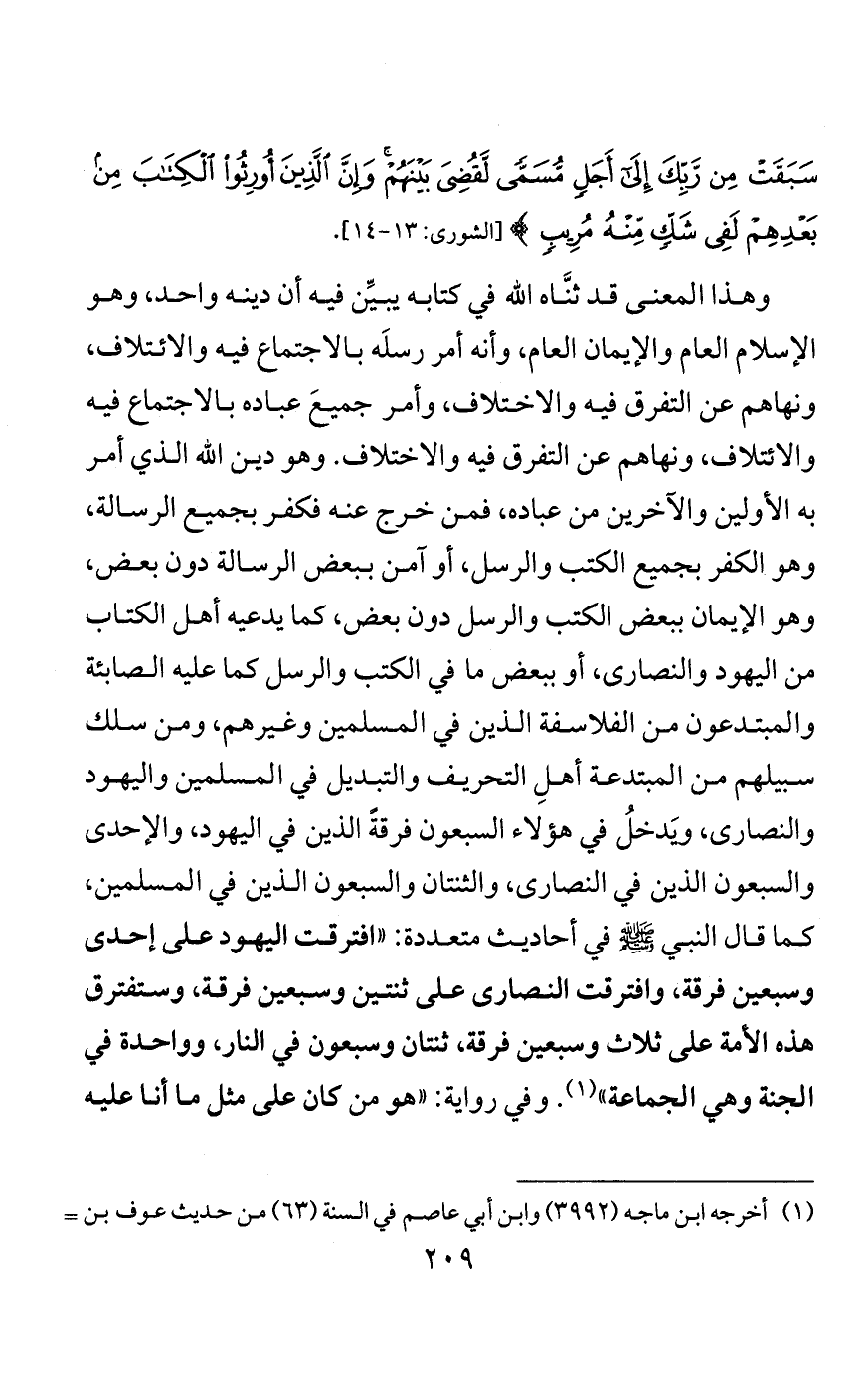 وذلك لأن المقصود الذي خلق له هو عبادة الله الجامعة لمعرفته بأسمائه وصفاتِه، ومحبتِه والإنابةِ إليه، وإخلاص الدين له، والطريق إلى ذلك هم رُسُل الله تعالى، فالإيمان بالله ورسوله هما المقصود والوسيلة، وبدون أحدهما لا يحصل ذلك، فمن أقرَّ بالخالق ولم يؤمن بالرسل لم يَعْلَم ما يحبه الله ويرضاه ويأمر به، ولا ما يكرهه ويسخطه وينهى عنه، ولم يعرف أيضًا من أسمائه وصفاته ما لا يُعرف إلا من الرسل، سواء في ذلك العلوم والأعمال التي قد يعلمها الإنسان بعقله، فإن هذا القسم ليس بيِّنًا في العقول ولا ظاهرًا للناس، ولا هو متَّفقٌ عليه بين أرباب العقل العام، بل مَنْ لم يهتدِ بنورِ الرسالة واكتفى فيه برأيه ورأي بني جنسه فإنه يقع في الشبهات والإشكالات والاختلاف والتفرق الذي لا يُحيط به إلا الله تعالى، كما نجده في الخارجين عن اتباع حقيقة الرسالة من المشركين والمجوس، والمبدِّلين المبتدعين من الصابئين واليهود والنصارى والمسلمين، وهم الذين تفرَّقوا على الأنبياء والرسل، كما قال صلى الله عليه وسلم في الحديث المُتَّفَق عليه عن أبي هريرة: «ذَرُوني ما تركتُكم، فإنما هلك من كان قبلكم بكثرة سؤالهم واختلافهم على أنبيائهم، فإذا نهيتُكم عن شيء فاجتنبوه، وإذا أمرتُكم بأمرٍ فَأْتُوا منه ما استطعتم».