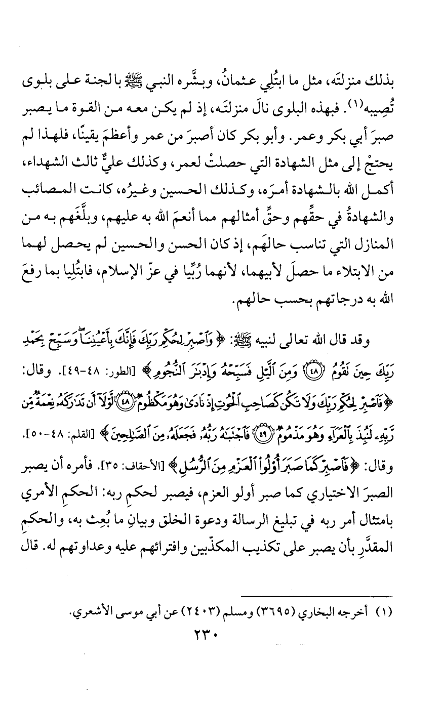 وأيضًا فالصبر على ما يحصل باختيار العبد، كصَبْرِ الداعي إلى الله والآمر بالمعروف والناهي عن المنكر على ما يُصيبه في ذلك من المكروه، ولو تركَه لم يُصِبْه، وصَبْر المطيع والممتنع عن المعصية إذا أوذي حتى يَعصِيَ، فصبرَ على الأذى ولم يَعْصِ، وصَبْر المؤمن على مفارقة محبوبِه باختياره وعلى احتمال المكروه باختياره= هذا الصبر أفضل من الصبر على المصائب التي لا حيلةَ له في دفعها، كالمرض وموتِ الأقارب، والجائحة التي تذهب بالمال، فإن هذا إن يصبرْ وإلا فلا فائدةَ له في الجزع، وهو لم يُمكِنْه دفعُها، ولهذا يشترك الناس في هذه المصائبِ، المؤمنُ والكافر. وأما تلك فإنما حصلتْ بسبب إيمانه وطاعته لله ورسولِه، فعلى ذلك أوذِيَ، فبإرادته واختياره حصلَ الأمرُ المكروه الذي يُريد أن يصبر عليه. فهذا أزكَى نفسًا وأعظمُ محبَّةً وصبرًا على طاعته، وأعظمُ تركًا لمحبوباته وفعلًا لمكروهاته لله. ولهذا كان مَنْ