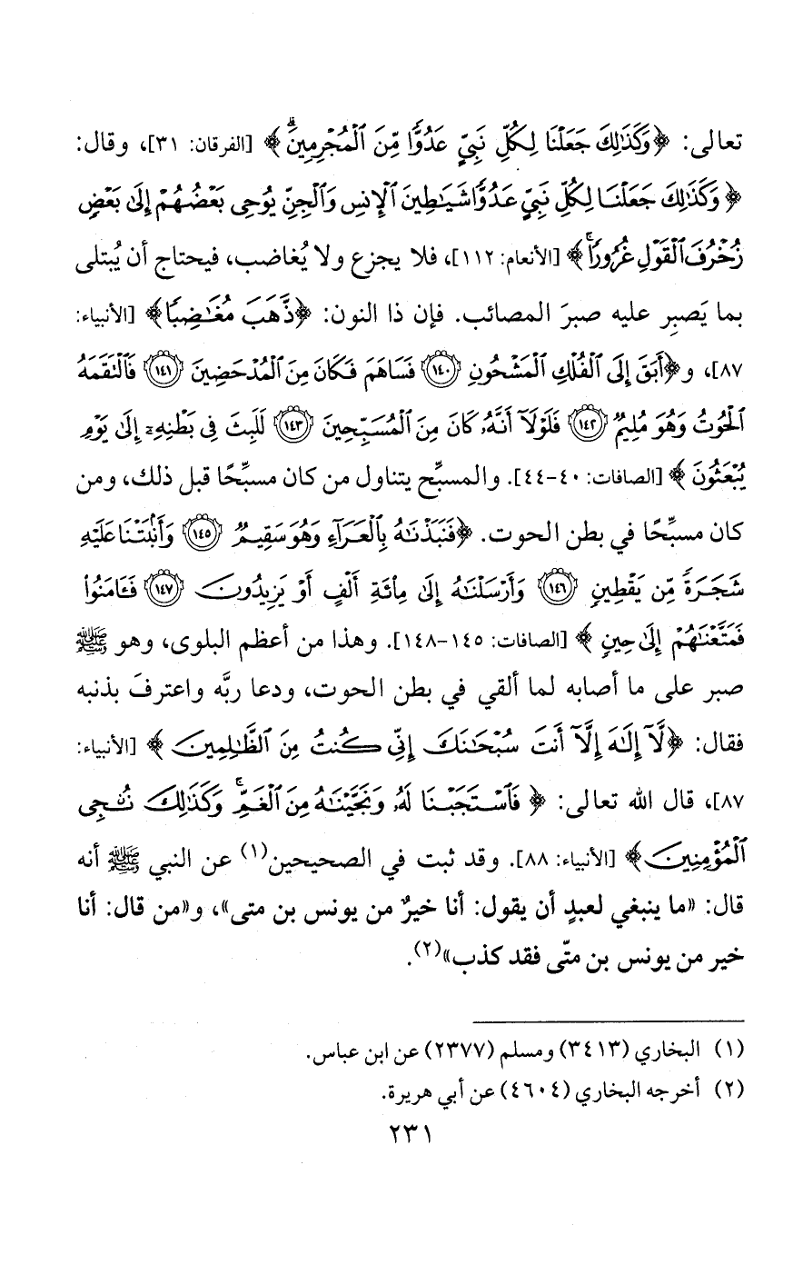 ومثال الأول صبر يعقوبَ عن ابنه يوسف، ومثال الثاني صبر الخليل على أن يذبحَ ابنَ، فإن الخليل كان يذبح بِكْرَهُ، لم يكن له غيرُه، وأراد أن يذبَحه باختياره، فأسلم الأب والابن لله. وهذا أعظم من حالِ إسرائيل، فإنه فُرِّق بينه وبين يوسف بغير اختياره، وصبرَ حتى ردَّه الله عليه. والله تعالى يبتلي كلَّ واحدٍ بحسب حالِه، فالخليل أعظمُ وأفضل، فاحتملَ هذا البلاء الذي لا يحتمله غيرُه لو ابتُليَ به، بخلاف صبر المصيبة، فإن الصبر عليه موجود كثيرًا. وكذلك صبر نوح وهود وصالح وموسى على تكذيب الكفَّار وأذاهم لهم هو من أعظم النوعين، وكذلك صبر نبينا محمد صلى الله عليه وسلم ومَنْ آمن معه على أذى الكفار لهم بأنواع الأذى، ثم صبرهم لما هاجروا على الجهاد.