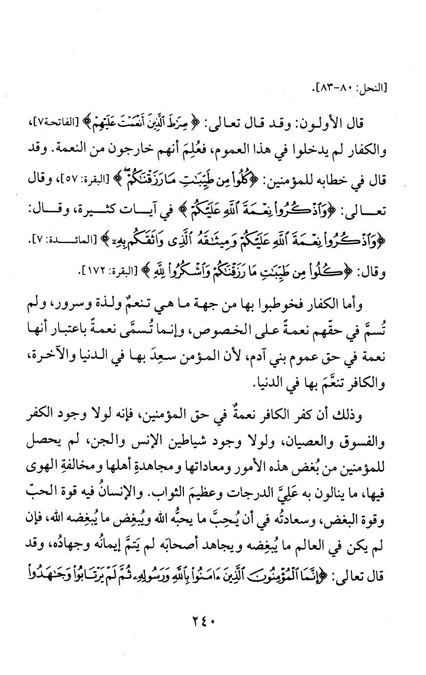 قال هؤلاء: والقرآن قد دلَّ على امتنانه على الكفار بنعمِه، ومطالبتِه إياهم بشكرها، فكيف يقال: ليستْ نِعَمًا؟ قال تعالى: {أَلَمْ تَرَ إِلَى الَّذِينَ بَدَّلُوا نِعْمَتَ اللَّهِ كُفْرًا} [إبراهم:28] إلى قوله: {اللَّهُ الَّذِي خَلَقَ السَّمَاوَاتِ وَالْأَرْضَ وَأَنْزَلَ مِنَ السَّمَاءِ مَاءً فَأَخْرَجَ بِهِ مِنَ الثَّمَرَاتِ رِزْقًا لَكُمْ وَسَخَّرَ لَكُمُ الْفُلْكَ لِتَجْرِيَ فِي الْبَحْرِ بِأَمْرِهِ وَسَخَّرَ لَكُمُ الْأَنْهَارَ (32) وَسَخَّرَ لَكُمُ الشَّمْسَ وَالْقَمَرَ دَائِبَيْنِ وَسَخَّرَ لَكُمُ اللَّيْلَ وَالنَّهَارَ (33) وَآتَاكُمْ مِنْ كُلِّ مَا سَأَلْتُمُوهُ وَإِنْ تَعُدُّوا نِعْمَتَ اللَّهِ لَا تُحْصُوهَا، إِنَّ الْإِنْسَانَ لَظَلُومٌ كَفَّارٌ} [إبراهم:32 - 34]. وقال تعالى: {إِنَّا هَدَيْنَاهُ السَّبِيلَ إِمَّا شَاكِرًا وَإِمَّا كَفُورًا} [الإنسان:3]. وكيف يكون كفورًا من لم يُنْعَم عليه؟!