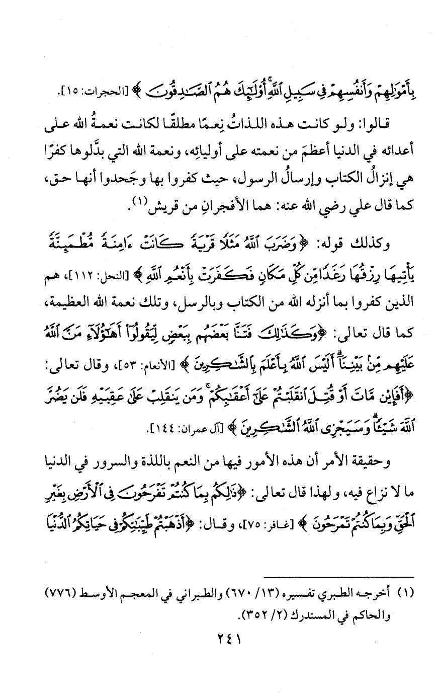 الإسلام، فإن الله قد ذمَّ الإنسانَ بكونه كَفَّارًا غيرَ شَكور، إذ يقول: {إِنَّ الْإِنْسَانَ لِرَبِّهِ لَكَنُودٌ} [العاديات:6]، وقال: {وَلَئِنْ أَذَقْنَا الْإِنْسَانَ مِنَّا رَحْمَةً ثُمَّ نَزَعْنَاهَا مِنْهُ إِنَّهُ لَيَئُوسٌ كَفُورٌ (9) وَلَئِنْ أَذَقْنَاهُ نَعْمَاءَ بَعْدَ ضَرَّاءَ مَسَّتْهُ لَيَقُولَنَّ ذَهَبَ السَّيِّئَاتُ عَنِّي إِنَّهُ لَفَرِحٌ فَخُورٌ} [هود:9 - 10]، وقد قال هود عليه السلام لقومه: {وَاذْكُرُوا إِذْ جَعَلَكُمْ خُلَفَاءَ مِنْ بَعْدِ قَوْمِ نُوحٍ وَزَادَكُمْ فِي الْخَلْقِ بَسْطَةً فَاذْكُرُوا آلَاءَ اللَّهِ لَعَلَّكُمْ تُفْلِحُونَ} [الأعراف:69]، وقال صالح لقومه: {وَاذْكُرُوا إِذْ جَعَلَكُمْ خُلَفَاءَ مِنْ بَعْدِ عَادٍ وَبَوَّأَكُمْ فِي الْأَرْضِ تَتَّخِذُونَ مِنْ سُهُولِهَا قُصُورًا وَتَنْحِتُونَ الْجِبَالَ بُيُوتًا فَاذْكُرُوا آلَاءَ اللَّهِ وَلَا تَعْثَوْا فِي الْأَرْضِ مُفْسِدِينَ} [الأعراف:74]. وقال في الآية الأخرى: {كَذَّبَتْ عَادٌ الْمُرْسَلِينَ (123) إِذْ قَالَ لَهُمْ أَخُوهُمْ هُودٌ أَلَا تَتَّقُونَ} إلى قوله: {وَاتَّقُوا الَّذِي أَمَدَّكُمْ بِمَا تَعْلَمُونَ (132) أَمَدَّكُمْ بِأَنْعَامٍ وَبَنِينَ (133) وَجَنَّاتٍ وَعُيُونٍ} [الشعراء:123 - 134]. وقال تعالى: {أَلَمْ تَرَ إِلَى الَّذِينَ بَدَّلُوا نِعْمَتَ اللَّهِ كُفْرًا} [إبراهيم:28]. وقال: {وَضَرَبَ اللَّهُ مَثَلًا قَرْيَةً كَانَتْ آمِنَةً مُطْمَئِنَّةً يَأْتِيهَا رِزْقُهَا رَغَدًا مِنْ كُلِّ مَكَانٍ فَكَفَرَتْ بِأَنْعُمِ اللَّهِ} [النحل:112]، وقال: {وَاللَّهُ جَعَلَ لَكُمْ مِنْ بُيُوتِكُمْ سَكَنًا وَجَعَلَ لَكُمْ مِنْ جُلُودِ الْأَنْعَامِ بُيُوتًا تَسْتَخِفُّونَهَا يَوْمَ ظَعْنِكُمْ وَيَوْمَ إِقَامَتِكُمْ وَمِنْ أَصْوَافِهَا وَأَوْبَارِهَا وَأَشْعَارِهَا} إلى قوله: {كَذَلِكَ يُتِمُّ نِعْمَتَهُ عَلَيْكُمْ} إلى قوله: {يَعْرِفُونَ نِعْمَتَ اللَّهِ ثُمَّ يُنْكِرُونَهَا وَأَكْثَرُهُمُ الْكَافِرُونَ}