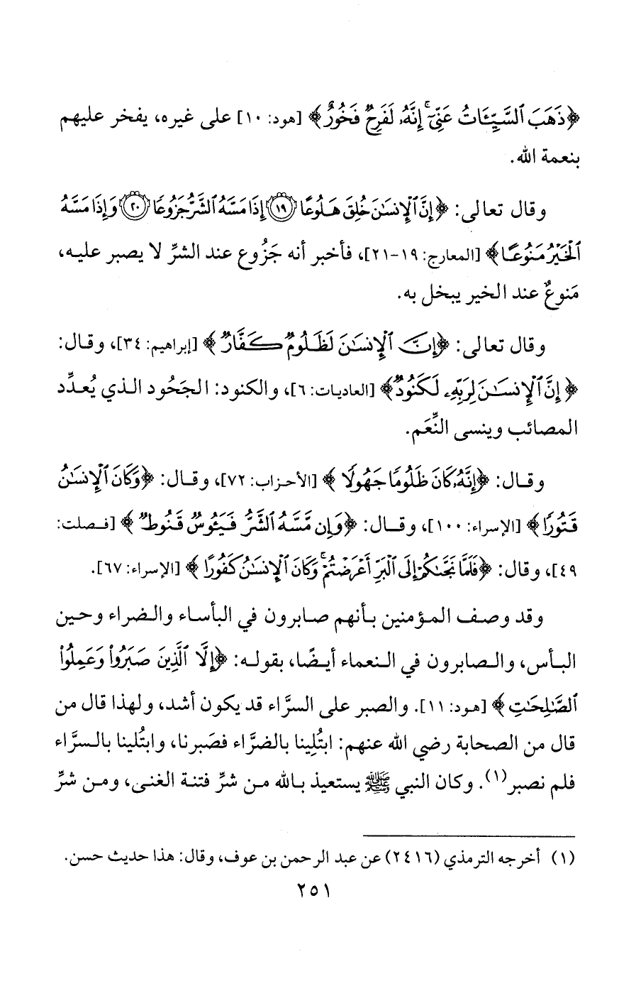 وإذا عُرِف أن كل واحد من الابتلاء بالسرَّاء والضرَّاء قد يكون في باطن الأمرِ مصلحةً للعبد أو مفسدةً له، وأنه إن أطاع الله فذلك كان مصلحةً له، وإن عصاه كان مفسدةً له= تبيَّن أن الناس أربعة أقسام: منهم من يكون صلاحُه على السَّراء، ومنهم من يكون صلاحُه على الضرَّاء، ومنه من يصلح على هذا وهذا، ومنهم من لا يصلح على أحدٍ منها. والإنسان الواحد قد يجتمع له هذه الأحوال الأربعة في أوقاتٍ أو وقتٍ واحدٍ، باعتبار أنواع يُبتلىَ بها.