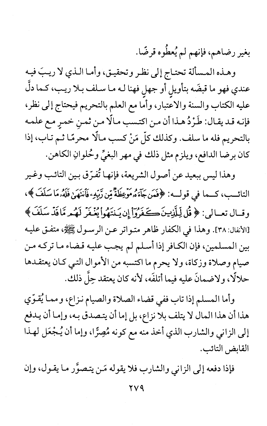 كُنْتُمْ مُؤْمِنِينَ} إلى قوله: {وَإِنْ تُبْتُمْ فَلَكُمْ رُءُوسُ أَمْوَالِكُمْ}. والتوبة تتناول المسلم العاصي كما تتناول الكافر، ولا خلاف أنه لو عامله بربا يحرم بالإجماع لم يقبض منه شيئًا، ثم تاب، أن له رأس ماله، فالآية تناولته، وقد قال فيها: {اتَّقُوا اللَّهَ وَذَرُوا مَا بَقِيَ مِنَ الرِّبَا}، ولم يأمر بردِّ المقبوض، بل قال قبل ذلك: {فَمَنْ جَاءَهُ مَوْعِظَةٌ مِنْ رَبِّهِ فَانْتَهَى فَلَهُ مَا سَلَفَ}.