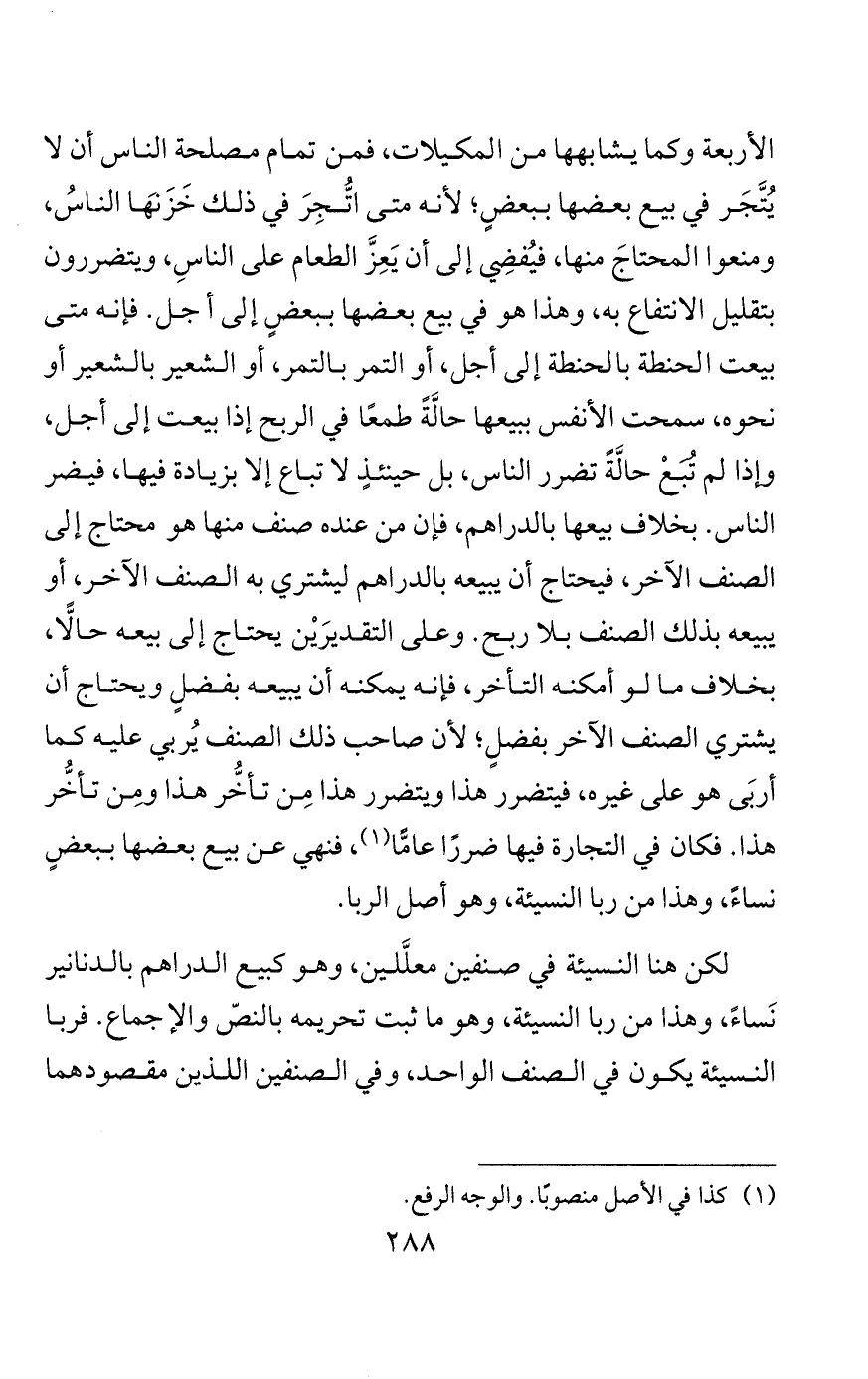 ولكن الدراهم والدنانير هي أثمان المبيعات، والثمن هو المعيار الذي به يُعرَف تقويمُ الأموال، فيجب أن يكون محدودًا مضبوطًا، لا تُرفع قيمته ولا تنخفض؛ إذ لو كان الثمن يرتفع وينخفض كالسِّلعَ لم يكن لنا ثمنٌ نعتبر به المبيعاتِ، بل الجميع سِلَعٌ، والحاجة إلى أن يكون للناس ثمن يعتبرون به المبيعات حاجة عامة، فإنه قد يحتاج إلى بيع ثمنٍ بغير إذنِ صاحبه، فلا يُباع إلا بثمن المثل، كتقويم الشِّقْصِ على من أعتقَ نصيبَه. والناسُ يشترون بالسعر شراءً عامًّا، فإنْ لم يكن سِعرٌ لم يُعرَف ما لبعضهم عند بعضٍ، وقد يُقوِّمون بينهم عُروضًا وغيرها ممن لا تعدل فيه الأنصباء إلَّا بالقيمة.