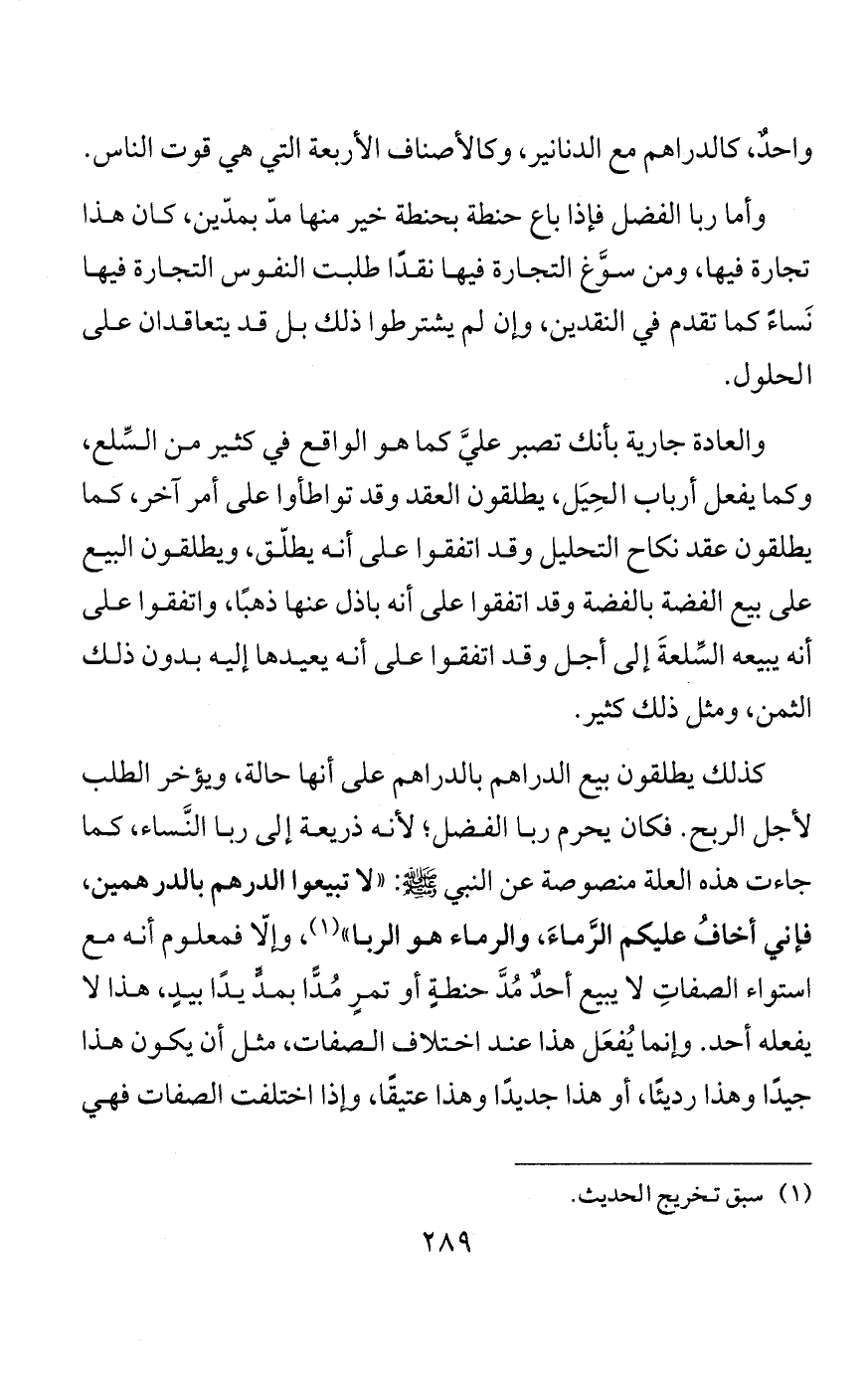 وقد حُرِّمَ فيهما ربا النَّسَاءِ لما فيه من الضرر كما تقدم، ولو أُبِيحَ ربا الفضل، مثل أن يبيعوا دراهمَ بدارهمَ أكثر منها، مثل أن يكون محتاجًا إلى دراهم خفافًا وأنصَافًا ومكسَّرةً فيشتريها، فلا يبيعه الصيرفي إلا بفضل باقٍ يأخذ منه من الصحاح أكثر من وزنها= صار ذلك تجارةً في الثمن، ومتى اتَّجروا فيها نقدًا تذرَّعوا إلى التجارة فيها نسيئةً. ولو أبيحت التجارة في الأثمان مثل أن يبيع دراهم بدارهم إلى أجل، لصارت الدراهم سلعةً من السلع، وخرجت عن أن تكون أثمانًا، فحرم فيها ربا الفضل، لأنه يُفضِي إلى ربا النَّسَاء، وربا النَّسَاء فيها يَضرّ وإن اختلفت بالصفات، لأنه يُخرِجها عن أن تكون أثمانًا.