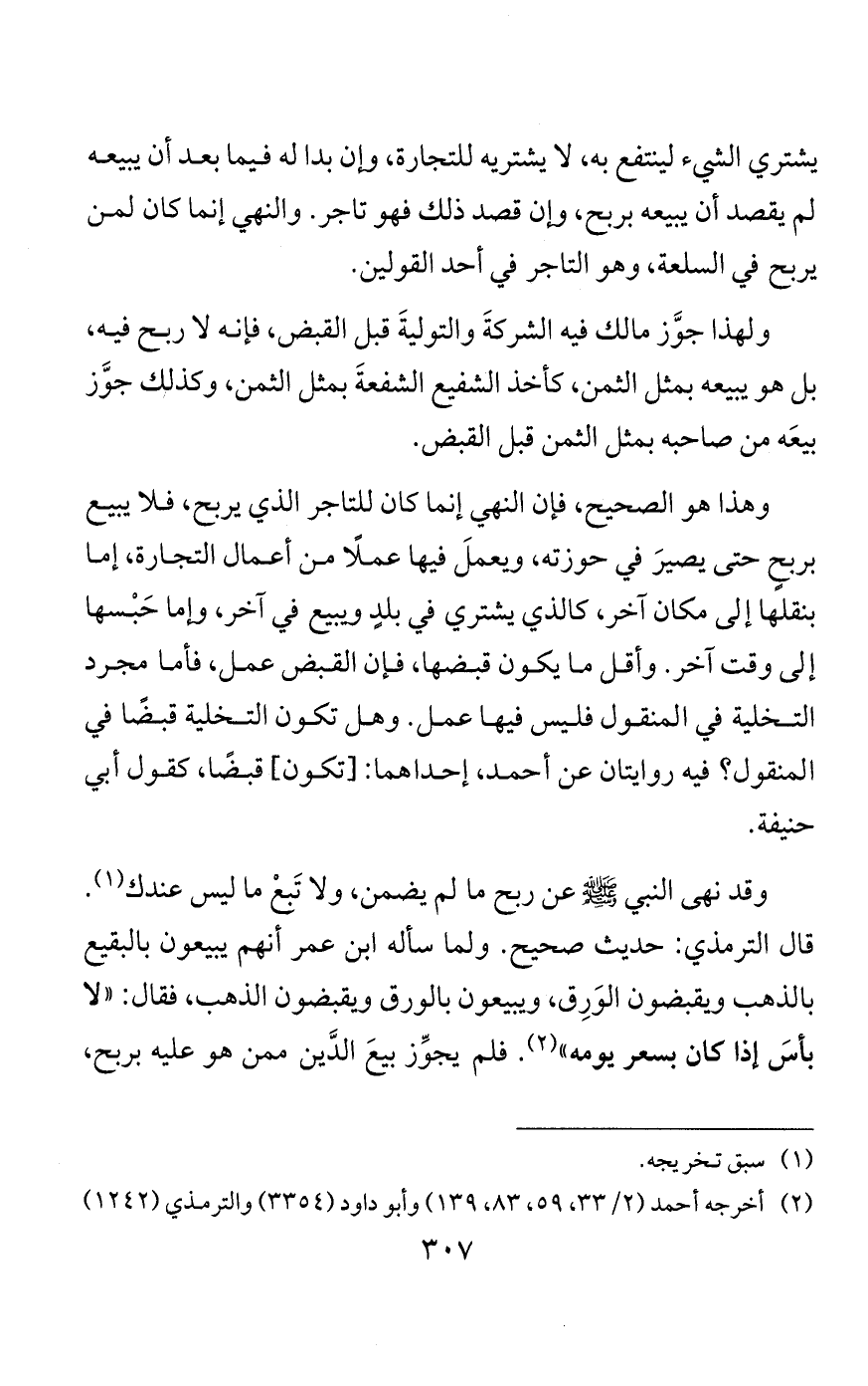 وقد ثبت في الصحيح أنهم كانوا إذا اشتروا الصبرة من الطعام نُهُوا أن يبيعوها في موضعها حتى ينقلوها؛ لأن هذا المشتري تاجرٌ إنما اشتراها ليربح فيها، فلا بدَّ أن يعمل فيها عمل التاجر، من نَقْلِها من مكان إلى مكان، أو حَبْسِها إلى حين يرتفع السعرُ، وأن يشتري جملةً ويبيع مفرقًا، ونحو ذلك. فأما إذا اشتراها وباعها في مكانها بربحٍ من غير أن يعمل فيها شيئًا فليس هذا بتاجر، وإن كانت صارت في ضمانه بتخلية البائع بينه وبينها.