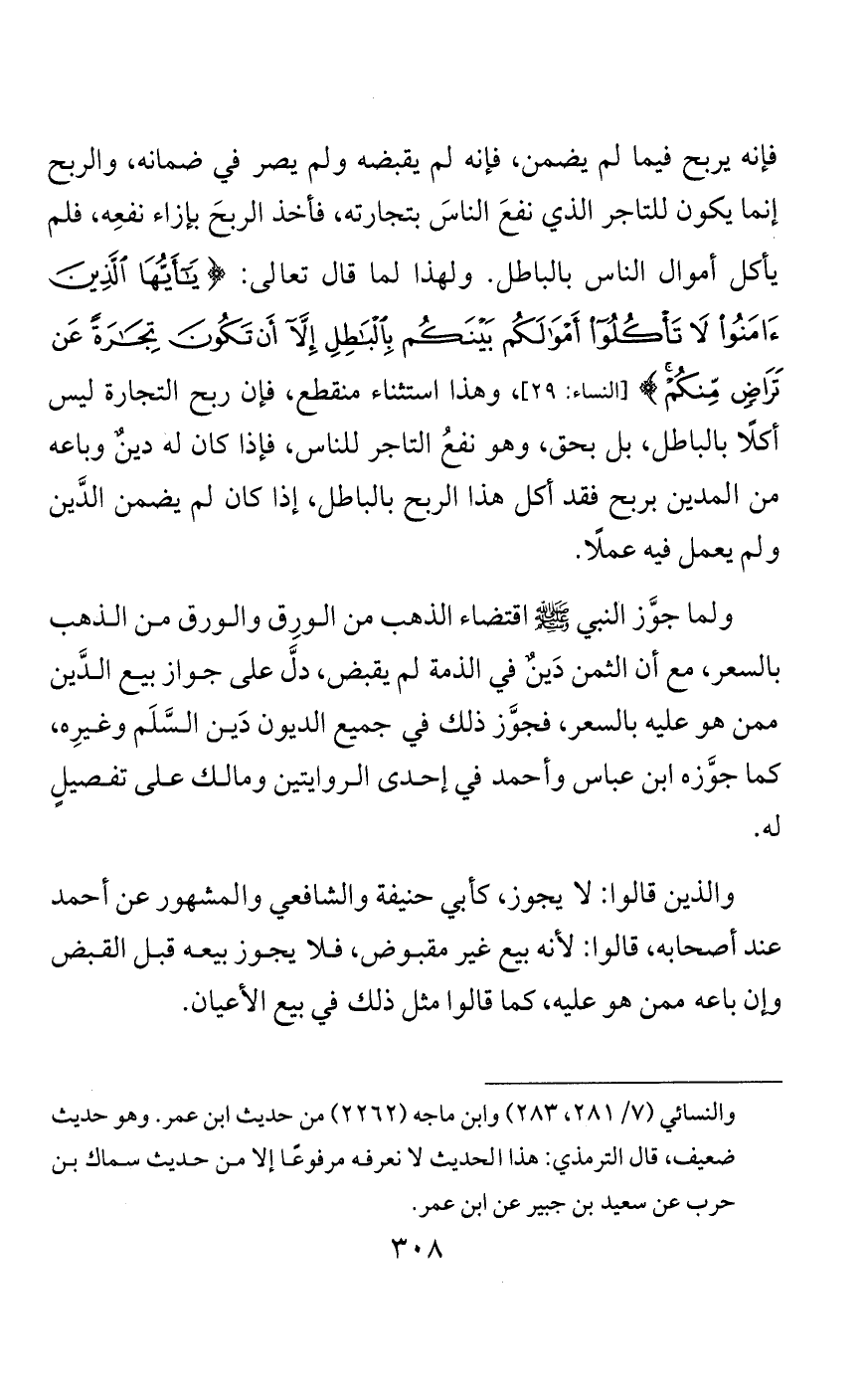 وقوله صلى الله عليه وسلم: «من ابتاعَ طعامًا فلا يبيعه حتى يستوفيه» هو نهيٌ للتاجر الذي يشتري الطعام ثم يبيعه، فهذا ليس له أن يبيعه حتى يستوفيه، وإن كان معينًا مضمونًا عليه بالتعيين. وابن عمر روى هذا، وروى هذا. قال ابن عمر: مضت السنةُ أن ما أدركتْه الصفقة حيًّا مجموعًا فهو من ضمان المشتري. وهذا احتج به مالك وأحمد وغيرهما أن ما كان معينًا ولم يمنعه البائع فهو يكون مضمونًا على المشتري وإن لم يقبضه.