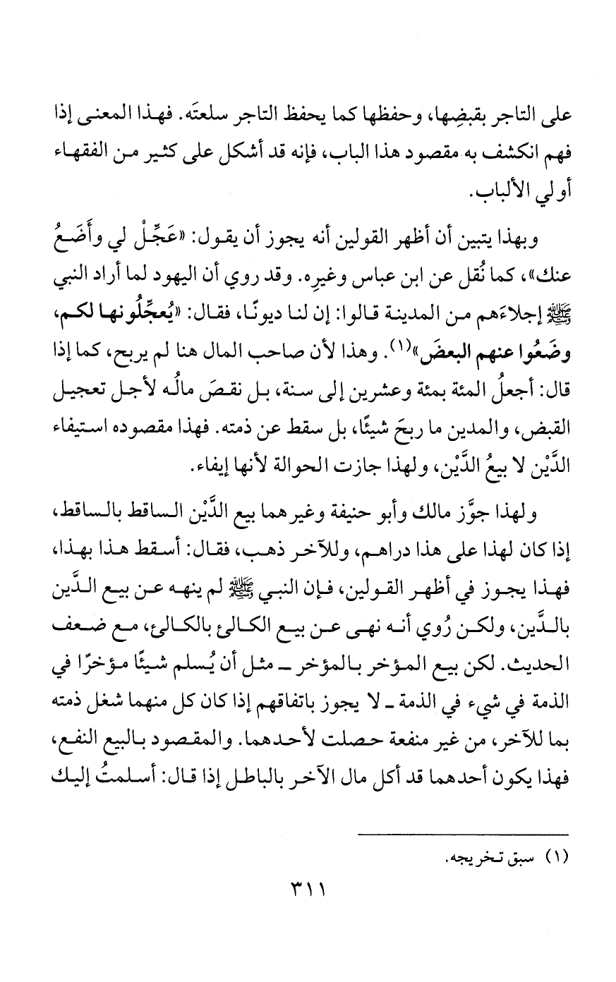 كذلك يخرج في التولية والشركة، إذ لا ربح هناك، وأيُّ فرقٍ بين دَيْنِ السَّلَمِ والثمن وكلاهما عوضٌ في الذمة؟ وقد جوَّز النبي صلى الله عليه وسلم الاعتياض عنه بسعر يومه. وأحمد يعتبر هذا الشرط هو ومالك وغيرهما، وأبو حنيفة لا يعتبره. والحديث يدل على الأصلين: على بيع الدَّيْن ممن هو عليه وإن كان عوضًا، وعلى أنه لا يبيعه بربح. وكذلك سائر الديون، كبدل القرض وغيره.