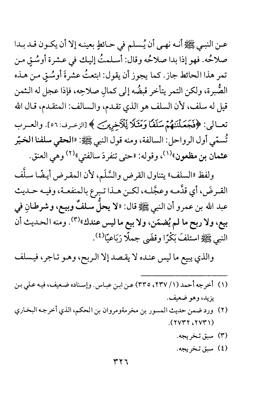 ومما يبيِّن أن هذا مراد النبي صلى الله عليه وسلم أن السائل إنما سأله عن بيع شيء مطلق في الذمة كما تقدم، لكن إذا لم يُجوَّزْ بيع ذلك فبيعُ المعيَّن الذي لم يملكه أولى بالمنع. وإذا كان إنما سأله عن بيع شيء في الذمة، وإنما سأله عن بيعه حالًا، فإنه قال: أبيعه ثم أذهب فأبتاعه، فقال له: «لا تَبِع ما ليس عندك»، فلو كان السَّلف الحال لا يجوز مطلقًا لقال ابتداءً: «لا تبع هذا» سواء كان عنده أو ليس عنده، فإن صاحب هذا القول يقول: بيعُ ما في الذمة حالًّا لا يجوز ولو كان عنده ما يُسلمه، بل إذا كان عنده فإنه لا يبيع إلا معينًا، لا يبيع شيئًا في الذمة. فلما لم ينهه النبي صلى الله عليه وسلم عن ذلك مطلقًا، بل قال: «لا تبع ما ليس عندك» = عُلِمَ أنه فرَّق بين ما هو عنده ويملكه ويقدر على تسليمه، وما ليس كذلك، وإن كان كلاهما في الذمة.