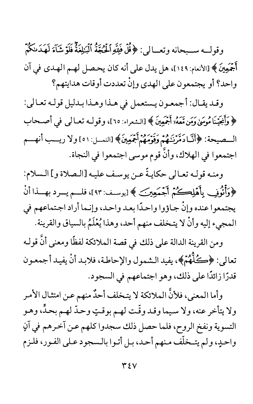 ومثله قوله تعالى: {أَفَلَمْ يَيْأَسِ الَّذِينَ آمَنُوا أَنْ لَوْ يَشَاءُ اللَّهُ لَهَدَى النَّاسَ جَمِيعًا} [الرعد:31]، ولو كان «جميعا» هنا تأكيدًا لقال: أجمعين.