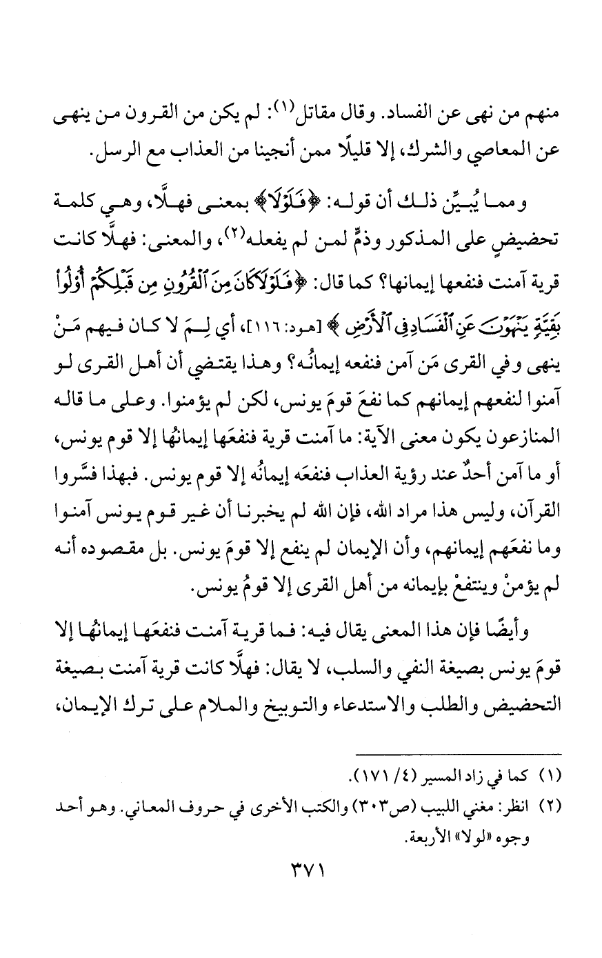 غيره وجبَ الفرقُ، والمريض تُقبل توبتُه ما لم يُغرْغِر ويُعايِنْ ملك الموت، وإن كان مرضه مخوفًا. فقوم يونس إنما أخبر الله عنهم أنهم لما آمنوا كشف عنهم عذابَ الخِزي في الحياة الدنيا، فبيَّن أن العذاب المكشوف كان مما يُعَذَّب به في الحياة الدنيا لم يكن هو العذاب الموجب للهلاك، ولو لم يفسّر ذلك فلفظ العذاب مجمل، والقرآن قد فرَّقَ بين النوعين، فلا يجوز حملُ هذا العذاب على العذاب الموجب للموت الذي لا يُقبل معه توبة، فإنّ في هذا مخالفةً لسائرِ آيات القرآن ولحكمةِ الربّ وعدلِه بلا دليلٍ؛ إذ كان اللفظ المجمل لا يعين أحد النوعين، فكيف إذا كان معه ما يقتضي التعيين أنه كان العذاب الأدنى، وإن كانوا قد عاينوه وأصابهم، فالتوبة بعد هذا العذاب مقبولة، فقد أصابَ قومَ فرعون من أنواع العذاب ما ذكره الله، ومع هذا فقد كان يقبل توبتهم لو تابوا ووعدوا بالإرسال، فلما كشف عنهم العذاب نقضوا عهدهم.