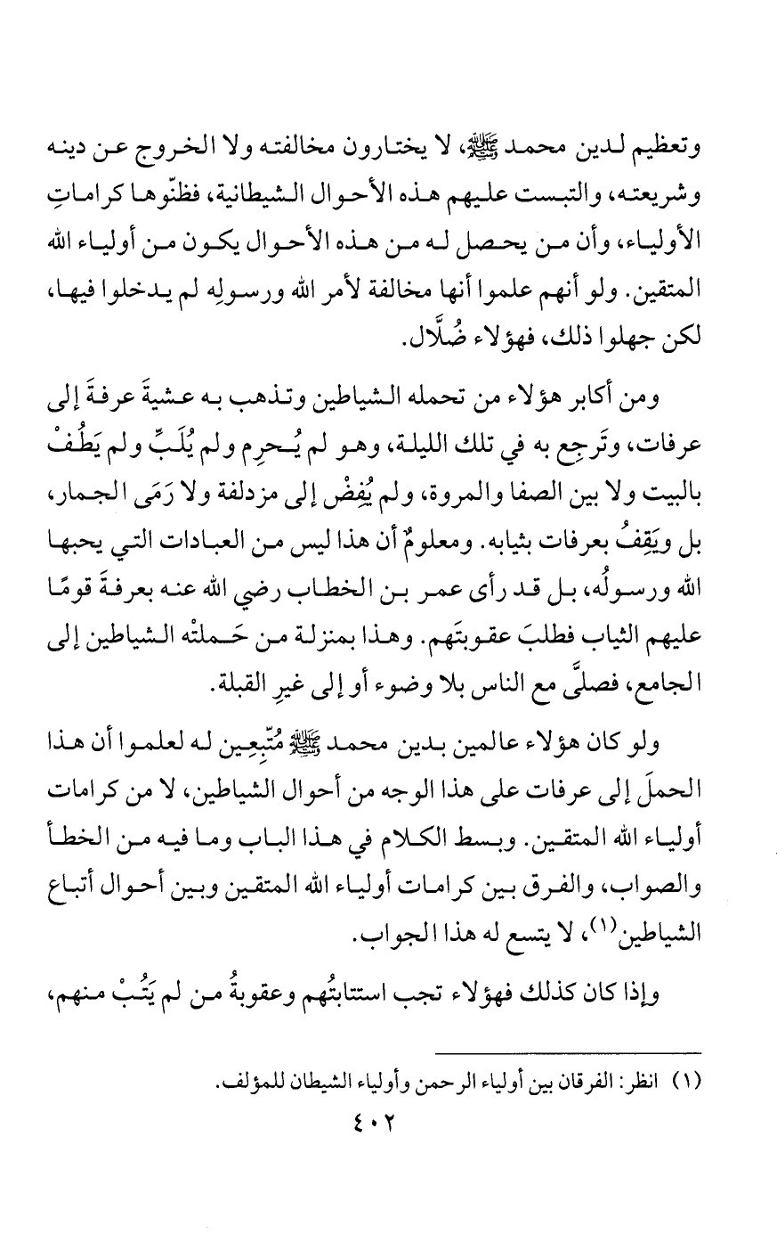 ولهذا لا يوجد من هؤلاء إلا من هو خارجٌ عن الكتاب والسنة، وإذا صدقَ مرةً في مكاشفته فلا بدَّ أن يكذب مرةً أخرى، وإن لم يتعمد هو الكذب لكن شيطانه الذي يُلقي في قلبه ما يُلقي وهو يكذب، كما كان يجري لمثل عبد الله بن صيَّاد الذي ظَنَّ بعضُ الصحابة أنه الدجّال ولم يكن هو الدجّال، ولكن كان من جنس الكهان، ولهذا لما خَبأ له النبي صلى الله عليه وسلم سورةَ الدخان قال: «قد خَبأتُ لك خبِيئًا»، فقال: الدُّخ الدُّخ، فقال النبي صلى الله عليه وسلم: «اخْسَأْ فلن تَعْدُوَ قَدْرَك». يريد: أنك من جنس الكهان الذي يقترن بأحدهم شيطان. وقال: «ما تَرى؟» قال: أرى عرشًا على الماء، وذلك عرش الشيطان. وقال له: «ما يأتيك؟» قال: يأتيني صادقٌ وكاذبٌ.