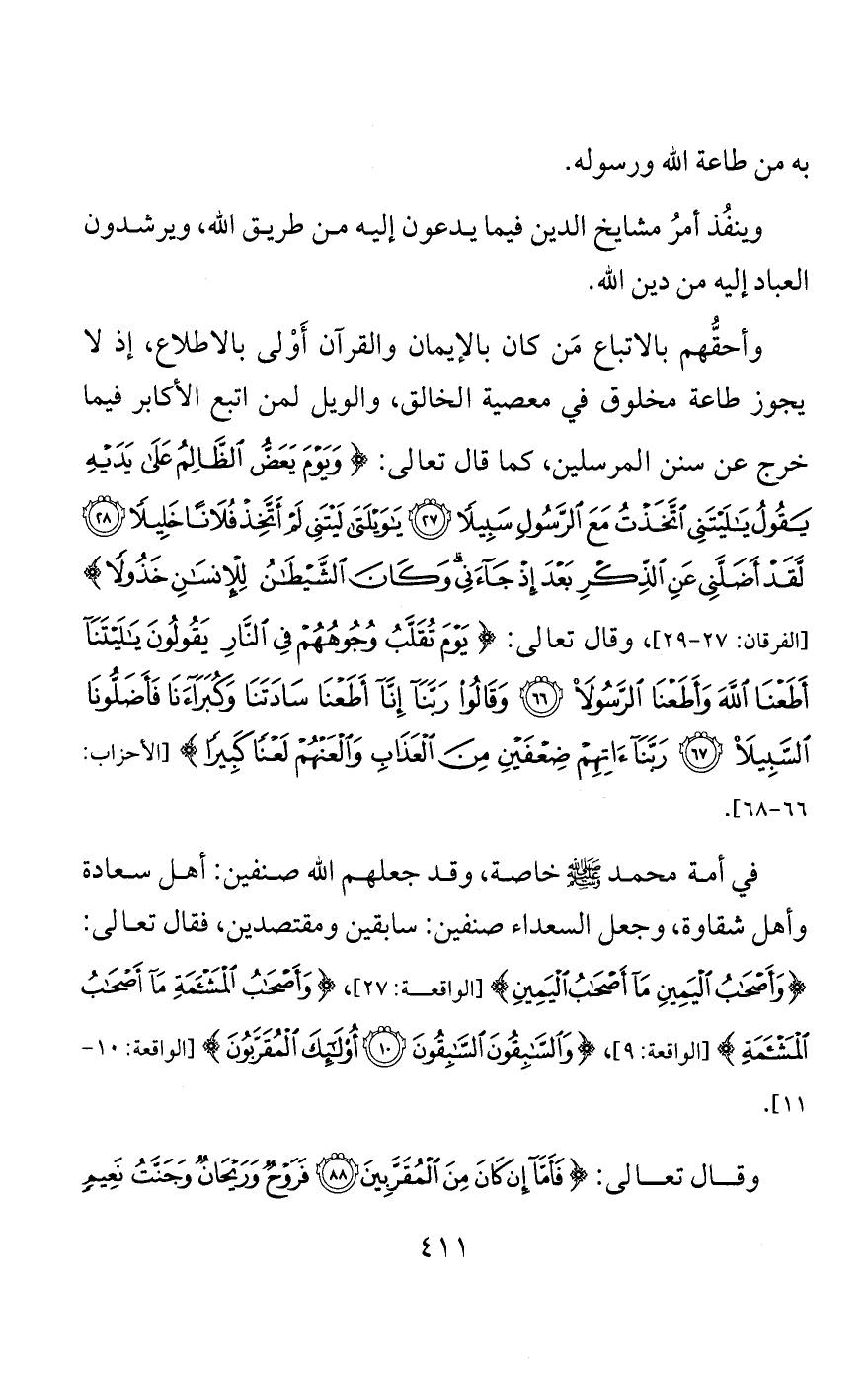ثم إنه قرن طاعته بطاعة رسوله، فقال: {يَا أَيُّهَا الَّذِينَ آمَنُوا أَطِيعُوا اللَّهَ وَأَطِيعُوا الرَّسُولَ وَأُولِي الْأَمْرِ مِنْكُمْ فَإِنْ تَنَازَعْتُمْ فِي شَيْءٍ فَرُدُّوهُ إِلَى اللَّهِ وَالرَّسُولِ إِنْ كُنْتُمْ تُؤْمِنُونَ بِاللَّهِ وَالْيَوْمِ الْآخِرِ ذَلِكَ خَيْرٌ وَأَحْسَنُ تَأْوِيلًا} [النساء:59]. [فوليُّ الأمر] منهم يُطاع فيما أمر الله بطاعته، وهو الأمر الذي يحتاج إليه فيه، وكان ذلك قد اجتمع في الخلفاء الراشدين الذين نصَّ رسولُ الله صلى الله عليه وسلم