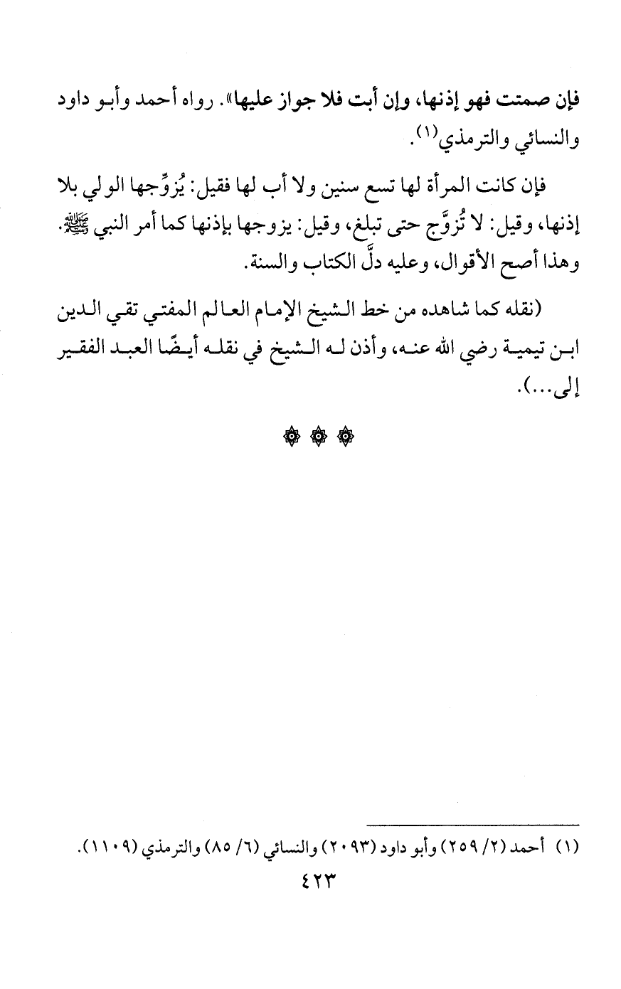 قال الشيخ الإمام المفتي تقي الدين أبو العباس أحمد ابن الشيخ للإمام العالم شهاب الدين عبد الحليم بن عبد السلام ابن تيمية رضي الله عنه كاتبُ الخط المنقول منه هذه الأحاديث: فالمرأة لا ينبغي لأحد أن يزوجها إلا بإذنها كما أمر النبي صلى الله عليه وسلم، فإن كرهت ذلك لم تُجبَر على النكاح إلا الصغيرة البكر، فإن أباها يزوجها ولا إذن. وأما البالغ الثيب فلا يجوز تزويجها بغير إذنها، لا للأب ولا لغيره، بإجماع المسلمين. وكذلك البكر البالغ ليس لغير الأب والجد تزويجها بدون إذنها بإجماع المسلمين. وأما الأب والجد فينبغي لهما استئذانها.