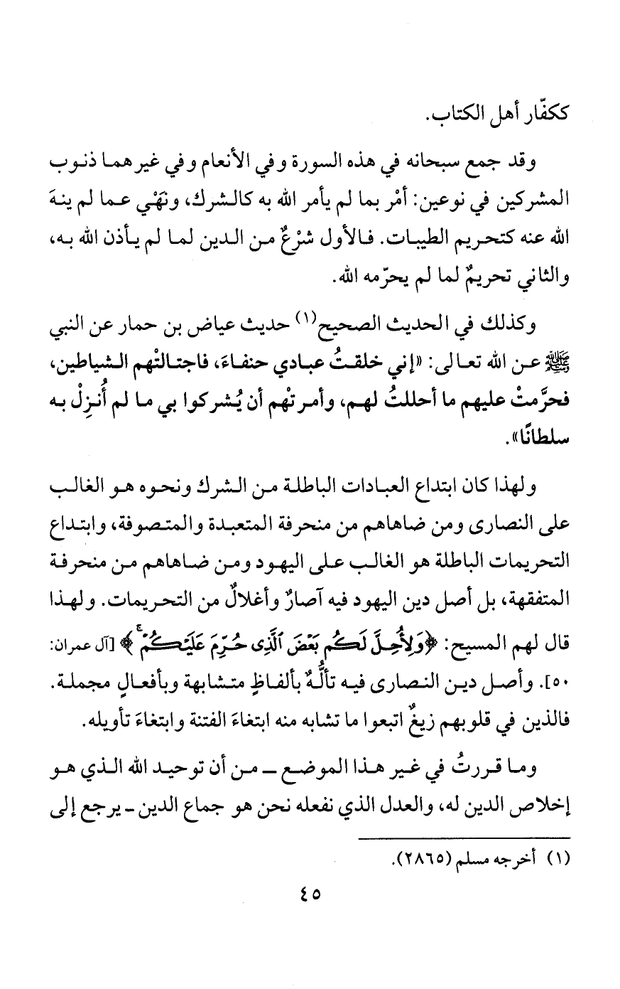 وبإزائهم قوم من الفقهاء والمحدثين والعبَّاد والعامّة ينتسبون إلى الكتاب والسنة والشرع، وهم لا يعلمون من ذلك ما يُحتاج إليه، بل فيهم من الجهل بحقائق ذلك أو التقليد لبعض رؤسائهم ما أوجب نقصَ الكتاب والسنة والشريعة في قلوب أولئك. فتقصيرُ هؤلاء وعدوانُ أولئك كان سببًا لذهاب ما ذهبَ من الدين، وظهورِ ما ظهر من البدع، والله أعلم.