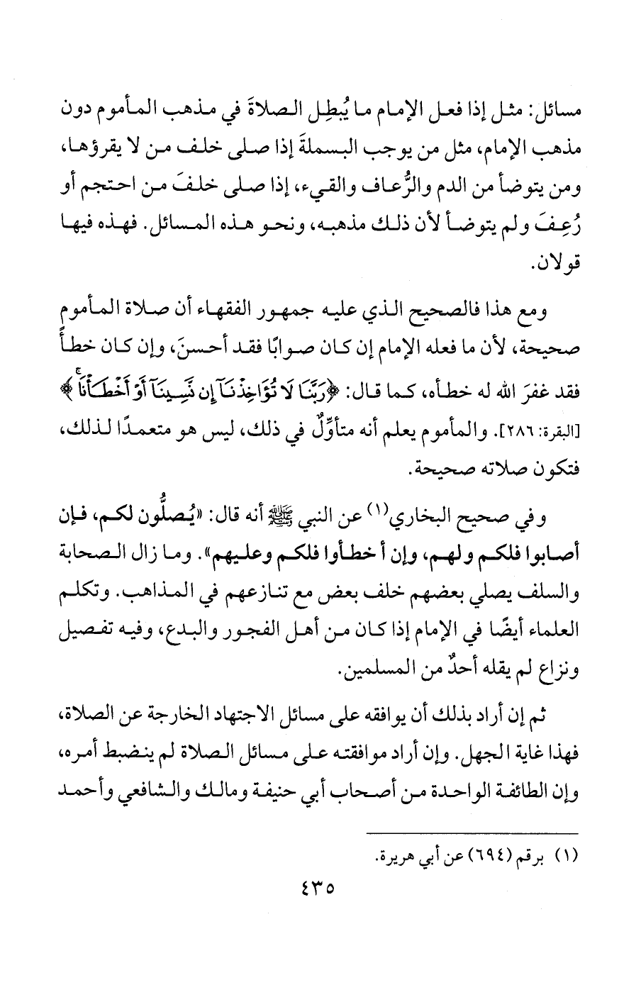 سبقه بركنٍ أو اثنين أو ثلاثة، وهو مدركٌ للإمام في تلك الركعة= أن صلاته تصح، فتصح صلاة هذا وهذا، كما أنه لو زاد في صلاته ركعةً نسيانًا لم تبطل، وكذلك لو زادها متأولًا جاهلًا لم تَبطُلْ، فالمخطئ في هذا الباب كالناسي. والله أعلم.