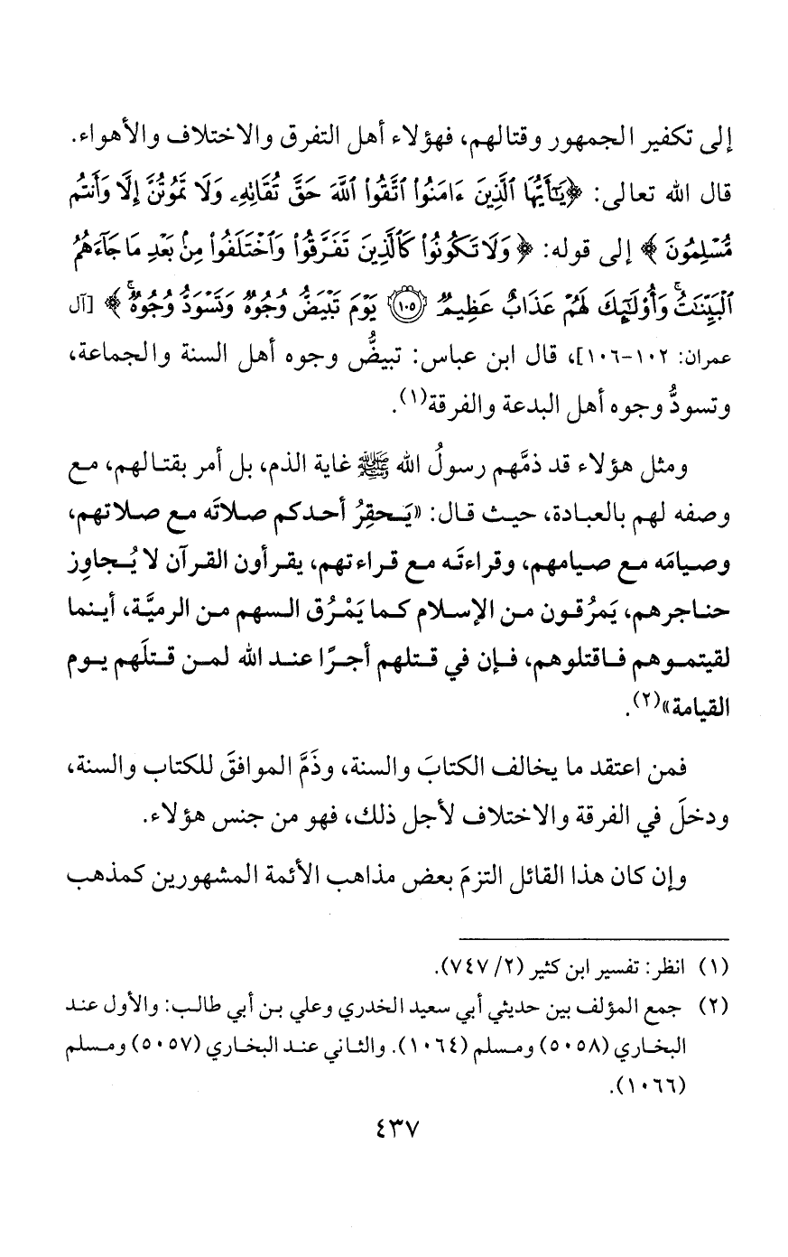 وفي صحيح البخاري عن النبي صلى الله عليه وسلم أنه قال: «يُصلُّون لكم، فإن أصابوا فلكم ولهم، وإن أخطأوا فلكم وعليهم». وما زال الصحابة والسلف يصلي بعضهم خلف بعض مع تنازعهم في المذاهب. وتكلم العلماء أيضًا في الإمام إذا كان من أهل الفجور والبدع، وفيه تفصيل ونزاع لم يقله أحدٌ من المسلمين.