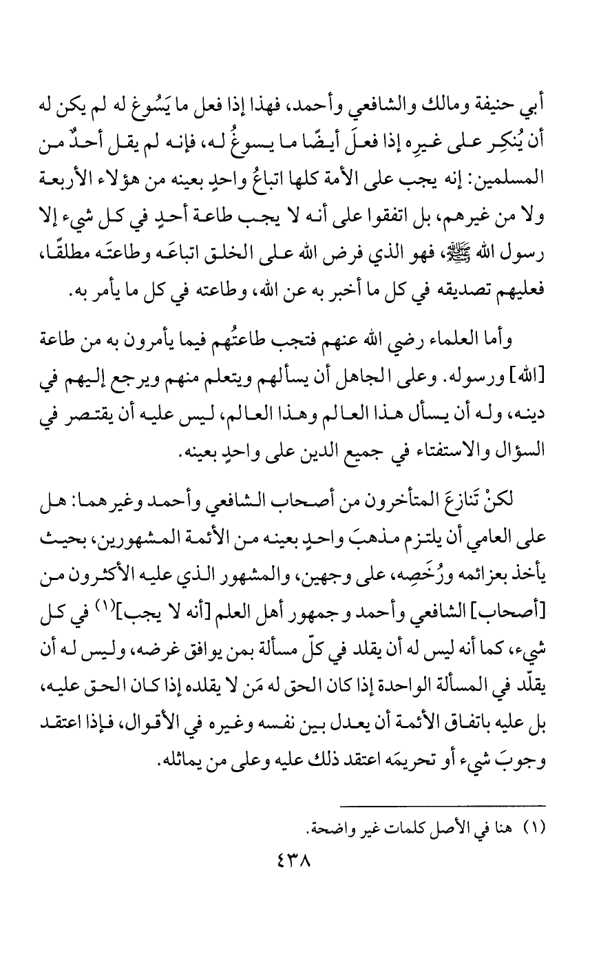 وقد قال بعض المتأخرين: إنه لا بدَّ أن ينوي المصلي أداءَ الواجب في تفاصيل الصلاة، وإنه إذا فعل ما يُوجبه المأموم دونَه ولم يَنوِ أنه واجبٌ لم يصحَّ الاقتداء به. وهذا قول محدَثٌ في الإسلام، لا أصل له عن أحدٍ من السلف. وما زال المسلمون يصلُّون ولا يُميِّزون هذا التمييز، لا اعتقادًا ولا نيةً، وكيف يمكن هذا والنزاع في واجباتها ومُبطِلاتها من أصعب مسائل الفقه، فكيف يُكلَّف كل مُصلٍّ أن يحرم باعتقادٍ لا يعلم دليله؟ ومن احتاط، فإذا ما اشتبه عليه واجب هو أو مستحب؟ وترك ما اشتبه أحرامٌ هو أم لا؟ فقد استبرأ لعِرضِه ودينِه. فكيف يُذمُّ مثل هذا؟
