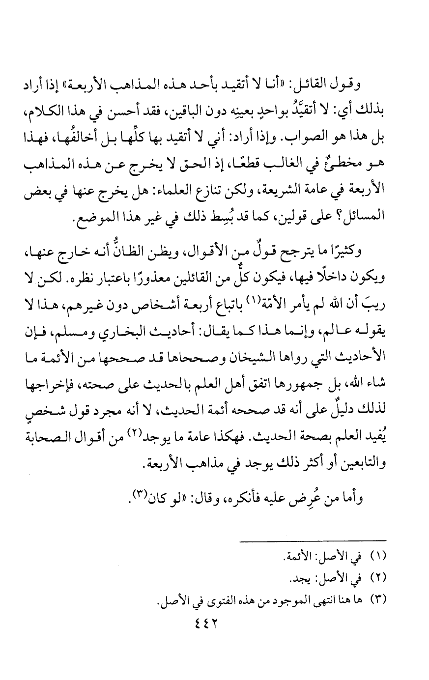 هذا في هذه= لم يكن على فاعلِ ذلك ملامٌ، ولم يكن ذلك الذي التزمَ قولَ واحدٍ بعينه أحسنَ حالًا منه، بل هذا أحسنُ حالًا من ذلك، لأن الأئمة الذين تُوُفُّوا كأبي حنيفة ومالك والشافعيّ وأحمد وغيرهم لا يمكن كثيرًا من العامة بل ولا أكثرهم أن يعرفوا مراتبَهم في العلم والدين، بل الخاصة من العلماء الذين لا هوى لهم قد يتعذر عليهم كثير من ذلك، فكيف لمن يتبع الظن وما تهوى الأنفس؟