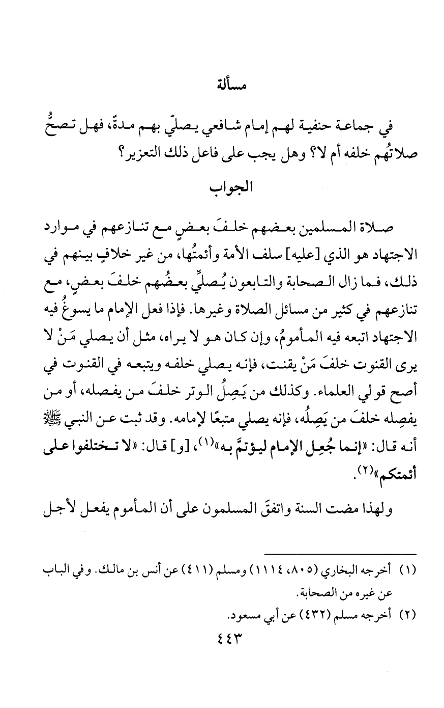 وقد ظهر بما ذكرناه أن قول القائل: «لا بدَّ لكل أحدٍ من التقليد لأحد هذه [المذاهب] الأربعة» هو قول طائفة من أصحاب الشافعي وأحمد، لكن الجمهور على خلافه، فإن هذا لا يجب على كل أحد. ومن قال: «أنا متقيدٌ بالكتاب والسنة» لم يجز لأحدٍ أن يقول له: أنت مارِقٌ، ومن قال له ذلك أُدِّبَ على ذلك؛ فإن المروقَ هو الخروج، كما قال النبي صلى الله عليه وسلم في صفة الخوارج: «يَمرُقون من الإسلام كما يَمرُقُ السهمُ من الرميَّة». وهؤلاء المارقون مَرَقُوا من السنة وخالفوا الجماعة، فمن تقيَّد بالكتاب والسنة كان متبعًا لا مبتدعًا، ومطيعًا لا عاصيًا.