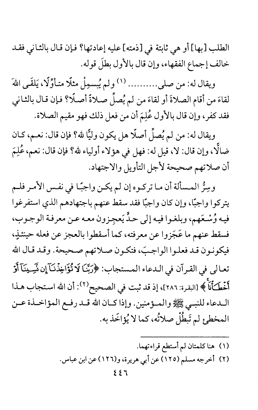 وقد تنازع العلماء فيما إذا صلى باجتهاده فترك ما هو واجب عند المأموم، أو فعلَ ما هو محرم عند المأموم، كالشافعي والحنبلي على قولٍ، فصلَّى خلف المالكي الذي لا يقرأ البسملة، أو المالكي والشافعي إذا خرج منه دمٌ ولم يتوضأ، فصلَّى خلفه حنفي أو حنبلي يرى الوضوء من ذلك، [وأمثال] هذه المسائل. فهذا إذا تيقَّنه المأموم ففي صلاته قولانِ مشهوران للعلماء، والنزاع في ذلك في مذهب الشافعي وأحمد وأبي حنيفة. وأما مذهب مالك فما أعلم فيه نزاعًا أنه يصح الصلاة خلفه. وهذا هو الصحيح المشهور عن أحمد في مسائل الاجتهاد التي تعارضت فيها النصوص. وكذلك الشافعي، وقد ثبت عنه أنه كان يصلي خلف المالكية، وهو يعلم أنهم لا يقرأون البسملة، وأبو يوسف صلَّى خلف هارون الرشيد، وقد احتجم وأفتاه مالك أنه لا يتوضأ.