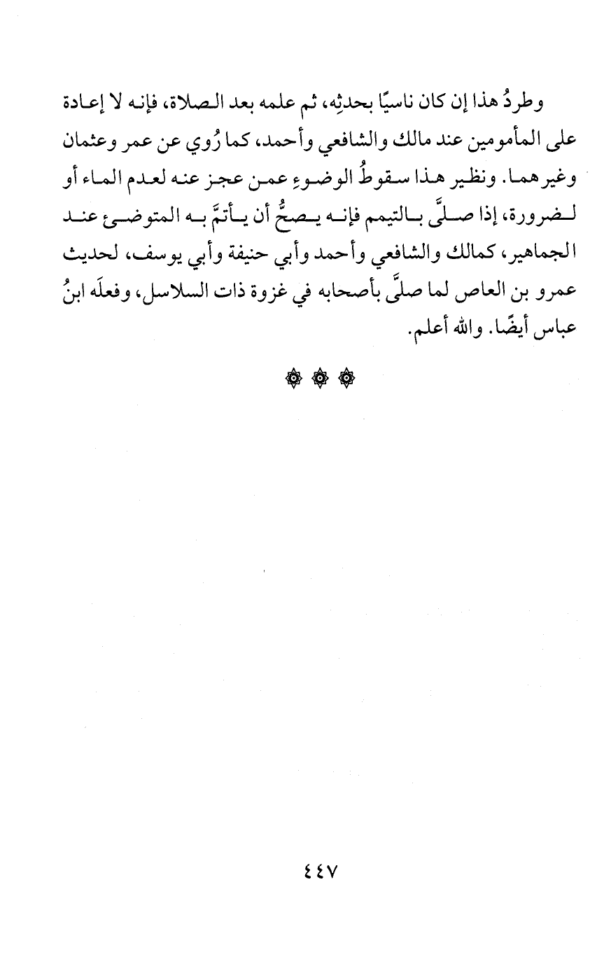 وبهذا يظهر الجواب عن قولهم: «إن المأموم يعتقد بطلانَ صلاة الإمام، فإذا علم بطلانَ صلاتِه كانت صلاتُه خلفه كالصلاة خلفَ من لا صلاة له، كالمحدِث المتعمد الصلاة مع حدَثِه». فإن هذا القياس خطأ وذلك أن المأموم يعلم أن الإمام مجتهد، إن أصاب فله أجران، وإن أخطأ فله أجر، وخطؤه مغفورٌ له، وإذا كان يعلم أنه لا إثمَ عليه فممتنعٌ أن يعتقد بطلانَ صلاته. وإن كان هو يرى بطلان صلاة نفسه، كما أنه لو فعل ما يعلم تحريمه أو ما يرى وجوبه، قدحَ ذلك في دينه وعدلِه، ولو فعل ذلك من هو مجتهد يسوغ له الاجتهاد لم يقدح ذلك في دينه وعدله.