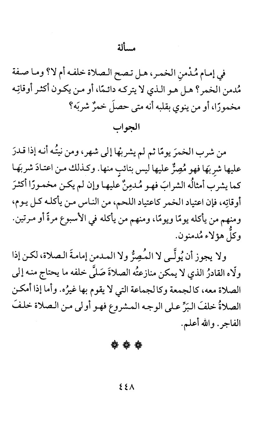 ويقال له: من صلى ... ... ولم يُبسمِلْ مثلًا متأوِّلًا، يَلقَى اللهَ لقاءَ من أقام الصلاةَ أو لقاءَ من لم يُصلِّ صلاةً أصلًا؟ فإن قال بالثاني فقد كفر، وإن قال بالأول عُلِمَ أن من فعل ذلك فهو مقيم الصلاة.