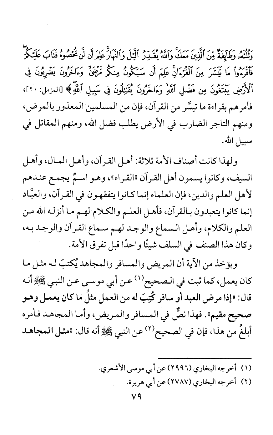 فأول ما أنزل على الرسول الأمر بقراءة الكتاب بقوله: {اقْرَأْ بِاسْمِ رَبِّكَ الَّذِي خَلَقَ} [العلق:1]، فلما هاجر إلى دار النصر أذن له أن يقاتل بالحديد، فالكتاب هو العلم، والحديد هو القدرة، وكلاهما سلطان، والكتاب قيام الصلاة، والحديد قيام الجهاد، ولهذا كانت أكثر الأحاديث عن النبي صلى الله عليه وسلم في الصلاة والجهاد، وكان الأمير يتولاهما جميعًا، أمير الحرب هو إمام الصلاة، وكلاهما فيه الصف الذي يحبُّه الله، وكلاهما فيه الطاعة والجماعة. ولهذا كان أول ما نزل من القرآن: {اقْرَأْ بِاسْمِ رَبِّكَ
