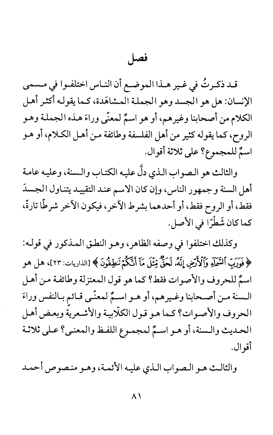 ولهذا كانت أصناف الأمة ثلاثة: أهل القرآن، وأهل المال، وأهل السيف، وكانوا يسمون أهل القرآن «القراء»، وهم اسمٌ يجمع عندهم لأهل العلم والدين، فإن العلماء إنما كانوا يتفقهون في القرآن، والعبَّاد إنما كانوا يتعبدون بالقرآن، فأهل العلم والكلام لهم ما أنزله الله من العلم والكلام، وأهل السماع والوجد لهم سماع القرآن والوجد به، وكان هذا الصنف في السلف شيئًا واحدًا قبل تفرق الأمة.