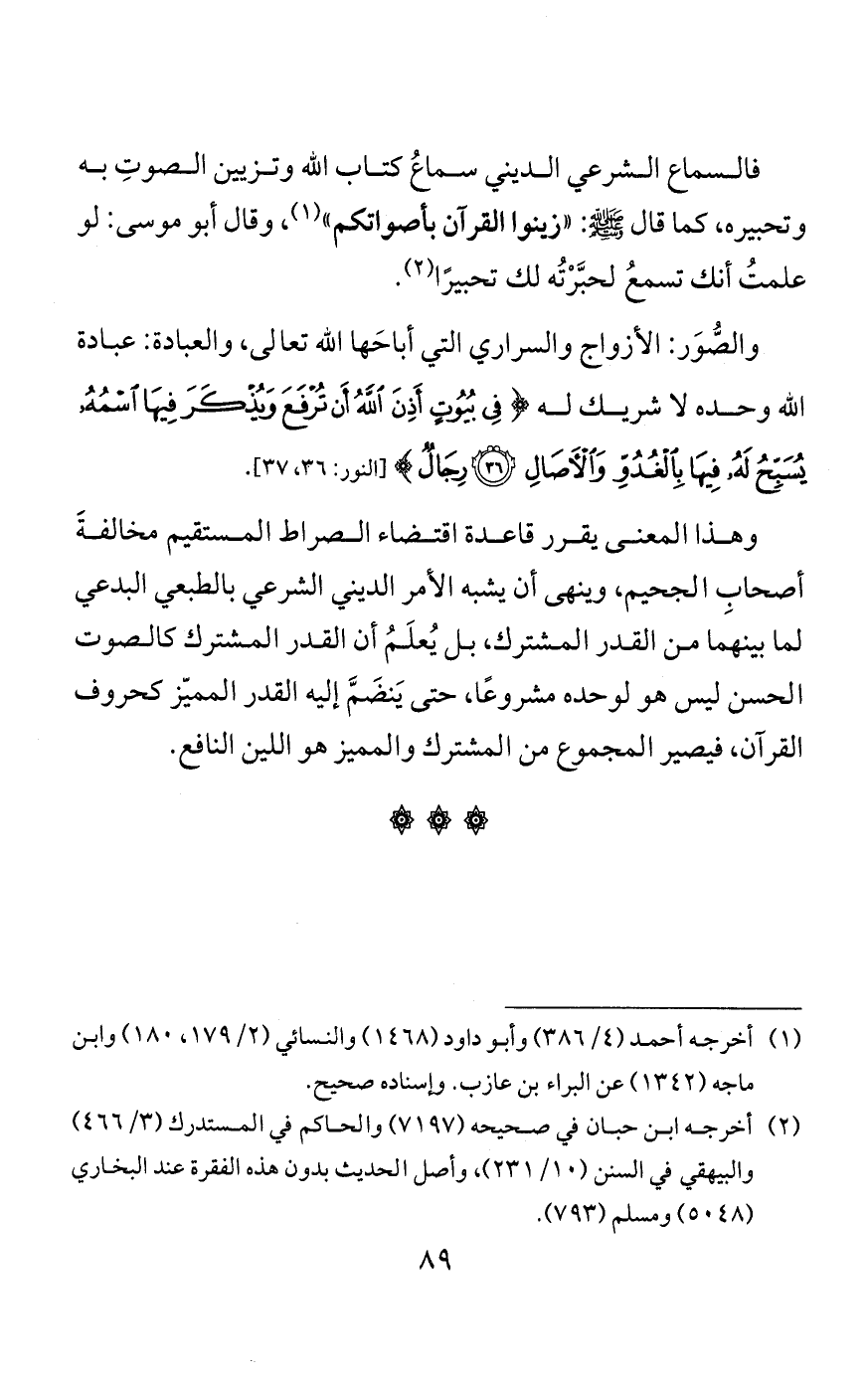 لكن العقلاء إذا وقعوا في ذلك علموا أنه من هَوَى النفوس، وأنه من الذنوب التي يجب على صاحبها التوبة والاستغفار. وأما الضالُّون فاتخذوه دينًا، كما قال تعالى: {اتَّخَذُوا دِينَهُمْ لَهْوًا وَلَعِبًا} [الأعراف:51]، فلَهَوْا عن الحق ولعبوا بالباطل. وهذا شأن هذه السيئات المنهي عنها من الأغاني ونحوه كالخمر، فإنها تَصُدُّ عن الحسنات المأمور بها من الذكر والصلاة والعلم النافع والعمل الصالح، وتُوقِع في مفاسدَ بحسبها، كما تُوقِع الخمرُ في العداوة والبغضاء، إما في زنًا وإما في نفاق، كما قال ابن مسعود: الغناء يُنبِتُ النفاقَ في القلب كما يُنبتُ الماءُ البقلَ.