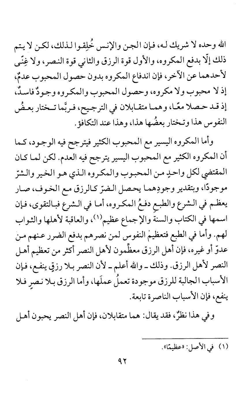ومن ذلك اللذة والفرح والسرور والنعيم، فإنه متعلق بحصولِ المحبوب واندفاع المكروه، والألمُ والغمُّ والحزنُ والعذابُ فإنه متعلق