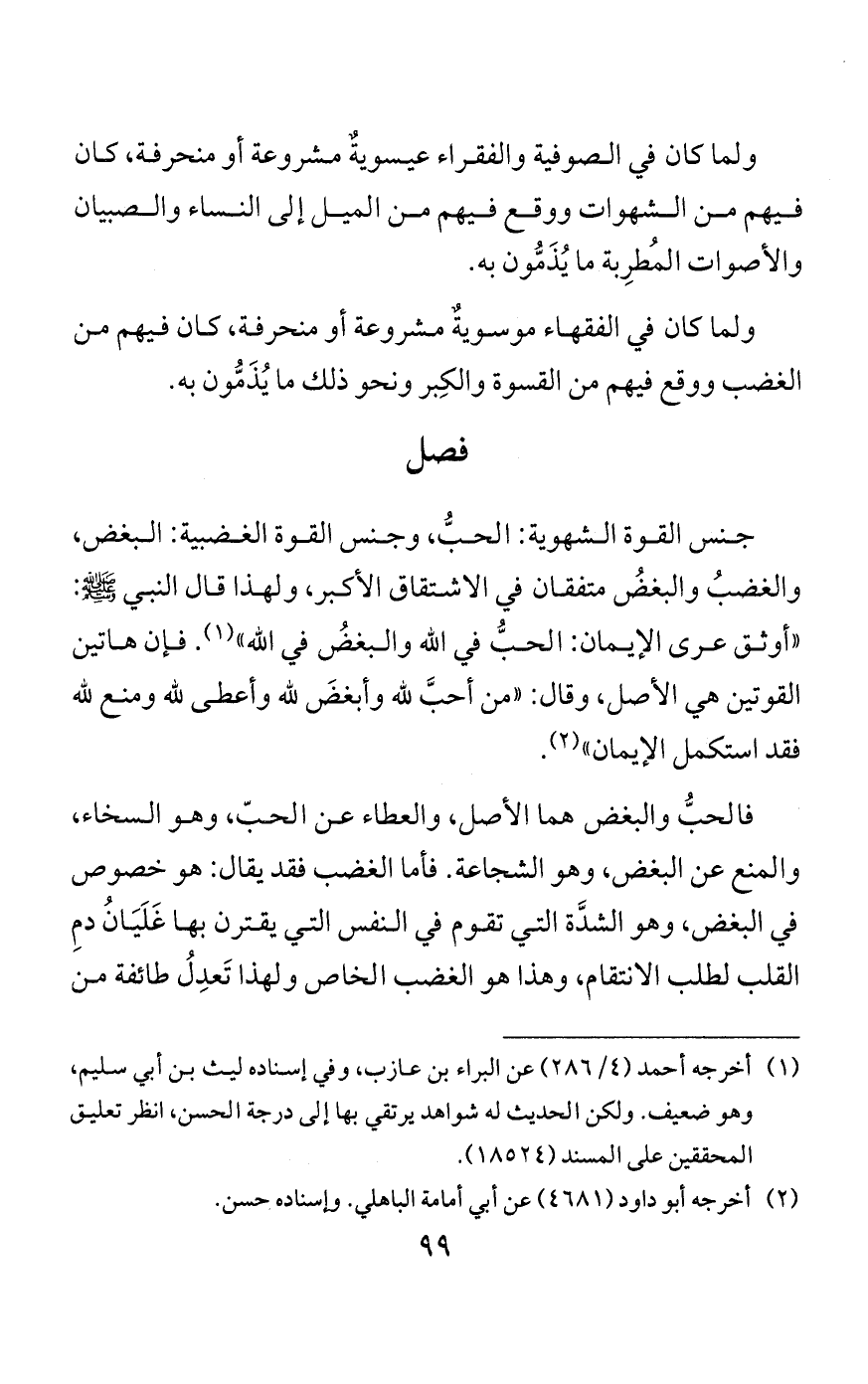 وفضيلة الشجاعة التي هي كمال القوة الغضبية، وكمال الشجاعة هو الحِلْم كما قال النبي صلى الله عليه وسلم: «ليس الشديدُ بالصُّرَعَةِ، وإنما الشديدُ الذي يَمْلِكُ نفسَه عند الغضب». والحلم والكرم مَلْزُوزَانِ في قَرَنٍ، كما أن كمال القوة الشهوية العفة. فإذا كان الكريم عفيفًا والشجاع حليمًا اعتدلَ الأمر.