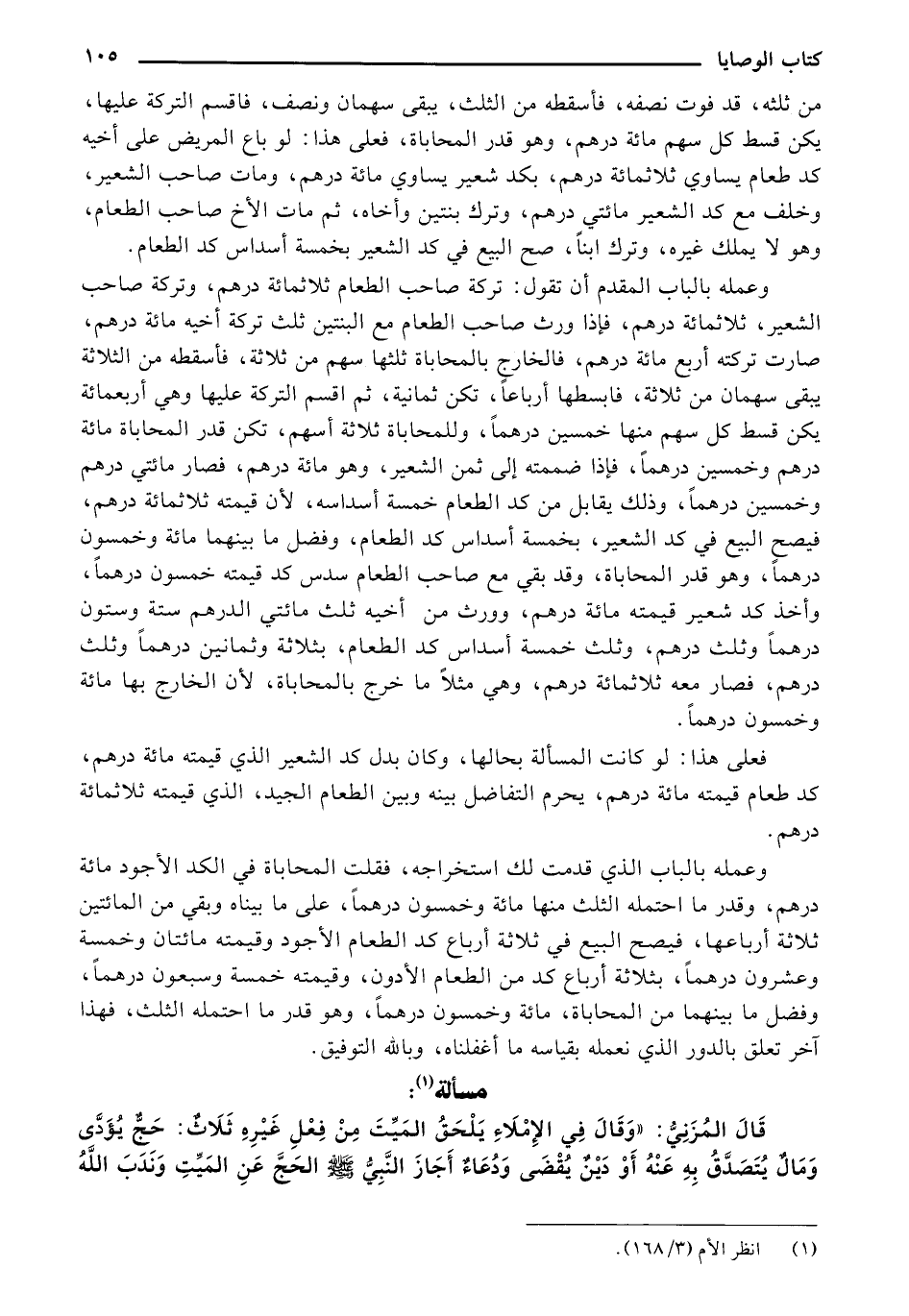 وعمله بالباب المقدم أن تقول: تركة صاحب الطعام ثلاثمائة درهم، وتركة صاحب الشعير، ثلاثمائة درهم، فإذا ورث صاحب الطعام مع البنتين ثلث تركة أخيه مائة درهم، صارت تركته أربع مائة درهم، فالخارج بالمحاباة ثلثها سهم من ثلاثة، فأسقطه من الثلاثة يبقي سهمان من ثلاثة، فابسطها أرباعًا، تكن ثمانية، ثم اقسم التركة عليها وهي أربعمائة يكن قسط كل سهم منها خمسين درهمًا، وللمحاباة ثلاثة أسهم، تكن قدر المحاباة مائة درهم وخمسين درهمًا، فإذا ضممته إلى ثمن الشعير، وهو مائة درهم، فصار مائتي درهم وخمسين درهمًا، وذلك يقابل من كد الطعام خمسة أسداسه، لأن قيمته ثلاثمائة درهم، فيصح البيع في كد الشعير، بخمسة أسداس كد الطعام، وفضل ما بينهما مائة وخمسون درهمًا، وهو قدر المحاباة، وقد بقي مع صاحب الطعام سدس كد قيمته خمسون درهمًا، وأخذ كد شعير قيمته مائة درهم، وورث من أخيه ثلث مائتي الدرهم ستة وستون درهمًا وثلث درهم، وثلث خمسة أسداس كدا الطعام، بثلاثة وثمانين درهمًا وثلث درهم، فصار معه ثلاثمائة درهم، وهي مثلًا ما خرج بالمحاباة، لأن الخارج بها مائة وخمسون درهمًا.