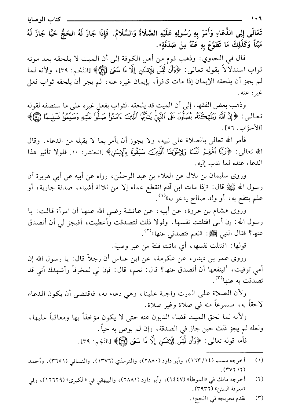 قال في الحاوي: وذهب قوم من أهل الكوفة إلى أن الميت لا يلحقه بعد موته ثواب استدلالًا بقوله تعالى: {وأَن لَّيْسَ لِلإنسَانِ إلاَّ مَا سَعَى (39)} [النجم: 39]، ولأنه لما لم يجز أن يلحقه الإيمان إذا مات كافرًا، بإيمان غيره عنه، لم يجز أن يلحقه ثواب فعل غيره عنه.