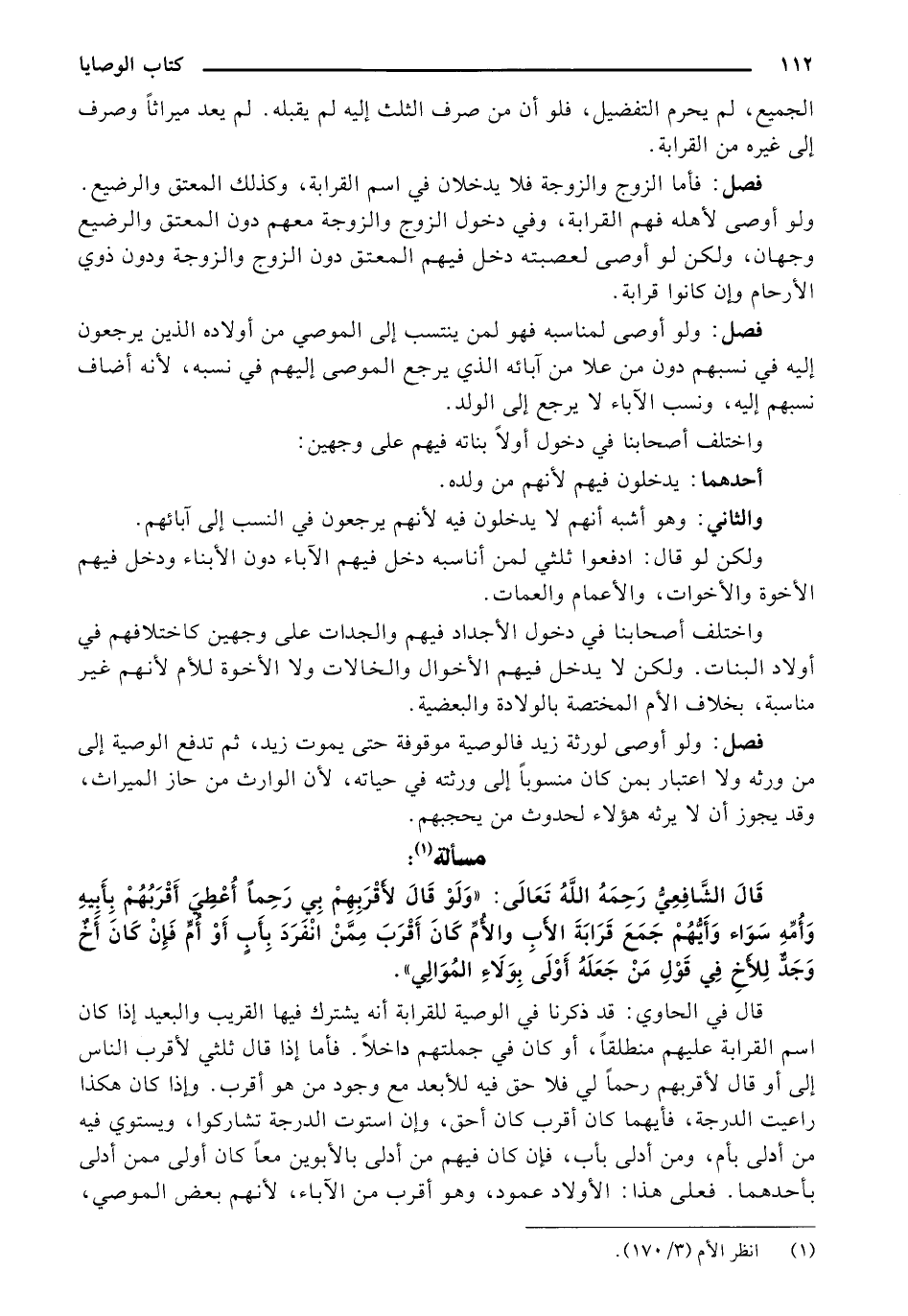 فصل: ولو أوصي لمناسبة فهو لمن ينتسب إلى الموصي من أولاده الذين يرجعون إليه في نسبهم دون من علا من آبائه الذي يرجع الموصي إليهم في نسبه، لأنه أضاف نسبهم إليه، ونسب الآباء لا يرجع إلى الولد.