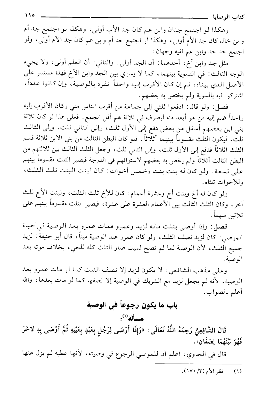 مثل جد وابن أخ، أحدهما: أن الجد أولى. والثاني: أن العلم أولى، ولا يجيء الوجه الثالث: في التسوية بينهما، كما لا يسوي بين الجد وابن الأخ فهذا مستمر على الأصل الذي بيناه، ثم إن كان الأقرب إليه واحدًا انفرد بالوصية، وإن كانوا عددًا، اشتركوا فيه بالسوية ولم يختص به بعضهم.