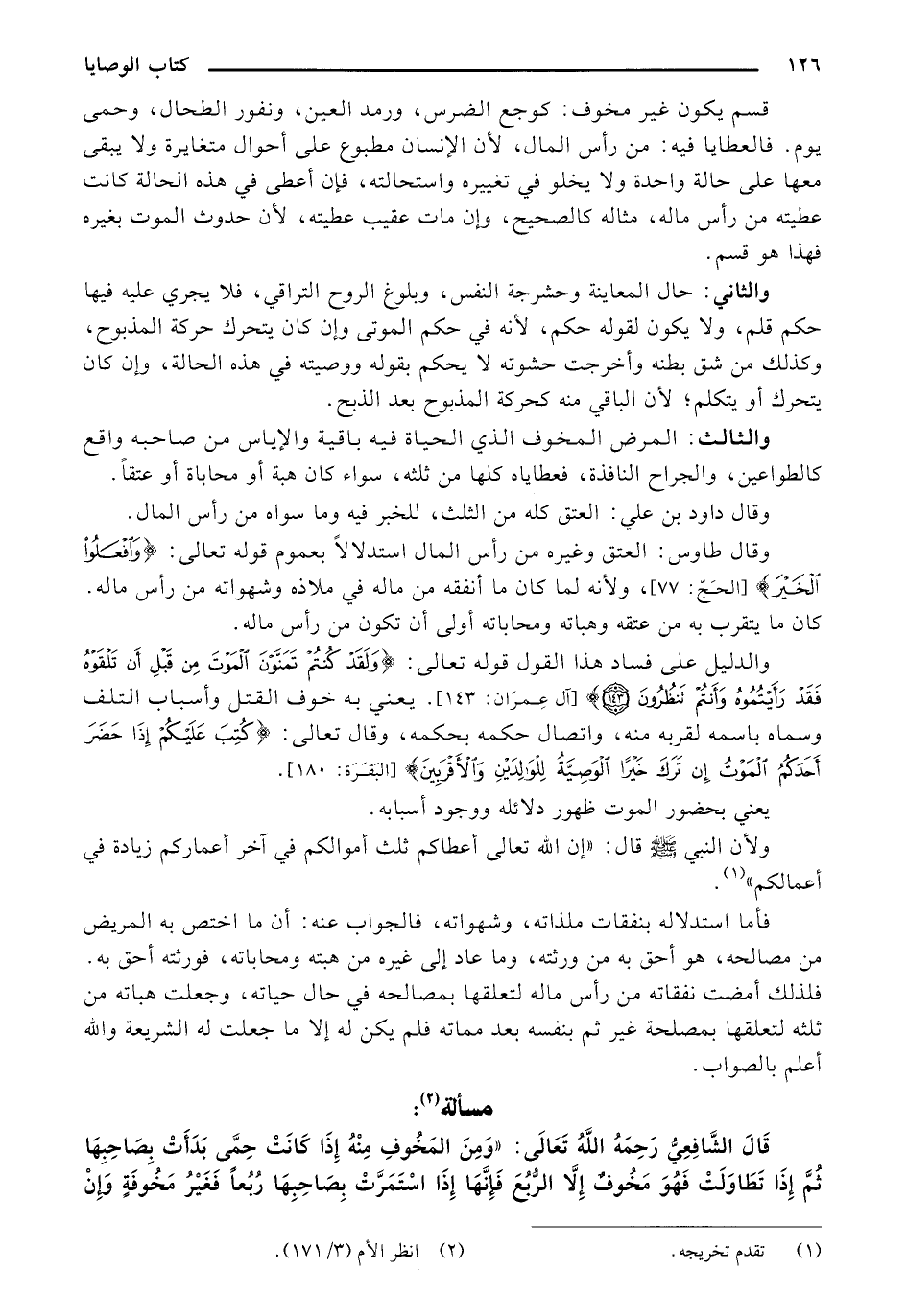 فأما استدلاله بنفقات ملذاته، وشهواته، فالجواب عنه: أن ما اختص به المريض من مصالحه، هو أحق به من ورثته، وما عاد إلى غيره من هبته ومحاباته، فورثته أحق به. فلذلك أمضت نفقاته من رأس ماله لتعلقها بمصالحة في حال حياته، وجعلت هباته من ثلثه لتعلقها بمصلحة غير ثم بنفسه بعد مماته فلم يكن له إلا ما جعلت له الشريعة والله أعلم بالصواب.