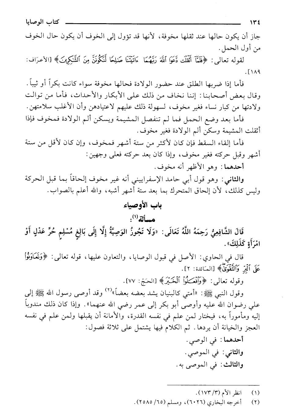 وقول النبي - صلى الله عليه وسلم -: «أمتي كالبنيان يشد بعضه بعضًا» وقد أوصي رسول الله - صلى الله عليه وسلم - إلى علي رضوان الله عليه وأوصي أبو بكر إلى عمر رضي الله عنهما». وإذا كان ذلك مندوبًا إليه ومأمورًا به، فيختار لمن علم في نفسه القدرة، والأمانة أن يقبلها ولمن علم في نفسه العجز والخيانة أن يردها. ثم الكلام فيها يشتمل على ثلاثة فصول: