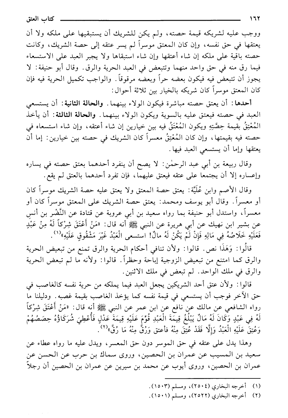 وقال الأصم وابن علية: يعتق حصة المعتق ولا يعتق عليه حصة الشريك موسرًا كان أو معسرًا. وقال أبو يوسف ومحمد: يعتق حصة الشريك على المعتق موسرًا كان أو معسرًا، واستدل أبو حنيفة بما رواه سعيد بن أبي عروبة عن قتادة عن النضر بن أنس عن بشير ابن نهيك عن أبي هريرة عن النبي - صلى الله عليه وسلم - أنه قال: «من أعتق شركًا له من عبد فعليه خلاصة في ماله فإن لم يكن له مال! استسعي العبد غير مشقوق عليه».