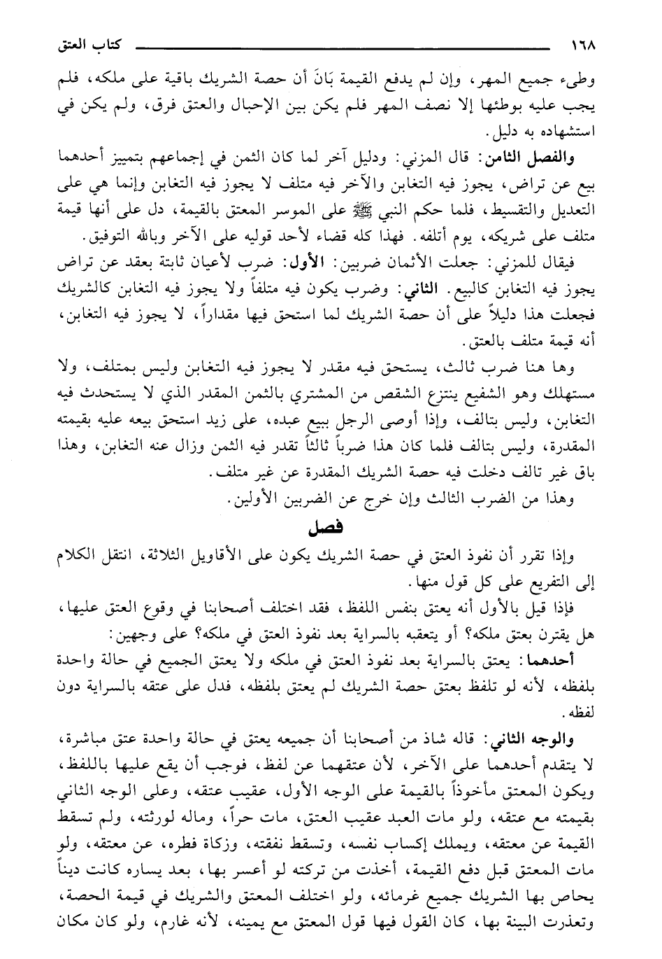 والفصل الثامن: قال المزني: ودليل آخر لما كان الثمن في إجماعهم بتمييز أحدهما بيع عن تراض، يجوز فيه التغابن والآخر فيه متلف لا يجوز فيه التغابن وإنما هي على التعديل والتقسيط، فلما حكي النبي - صلى الله عليه وسلم - على الموسر المعتق بالقيمة، دل على أنها قيمة متلف على شريطه، يوم أتلفه. فهذا كله قضاء لأحد قوليه على الآخر وبالله التوفيق.