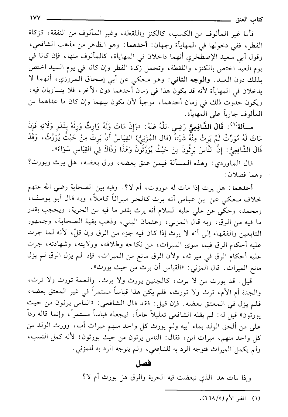 مسألة: قال الشافعي رضي الله عنه: «وإن مات وله وارث ورثه بقدر ولائة فإن مات له مورث لم ييرث منه شيئًا (قال المزني) القياس أن يرث من حيث يورث، وقد قال الشافعي: إن الناس يرثون من حيث يورثون وهذا وذاك في القياس سواء».