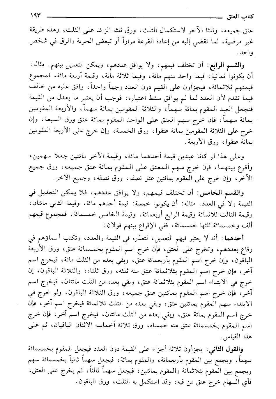 والقسم الرابع: أن تختلف قيمهم، ولا يوافق عددهم، ويمكن التعديل بينهم. مثاله: أن يكونوا ثمانية: قيمة واحد منهم مائة، وقيمة ثلاثة مائة، وقيمة أربعة مائة، فمجموع قيمتهم ثلاثمائة، فيجزأون على القيم دون العدد وجهًا واحدًا، وافق عليه من خالف فيما تقدم لأن العدد لما لم يوافق سقط اعتباره، فوجب أن يعتبر ما يعدل من القيمة فنجعل العبد المقوم بمائة سهمًا، والثلاثة المقومين بمائة سهمًا، والأربعة المقومين بمائة سهمًا، فإن خرج سهم العتق على الواحد المقوم بمائة عتق ورق السبعة، وغن خرج على الثلاثة المقومين بمائة عتقوا، ورق الخمسة، وإن خرج على الأربعة المقومين بمائة عتقوا، ورق الأربعة.