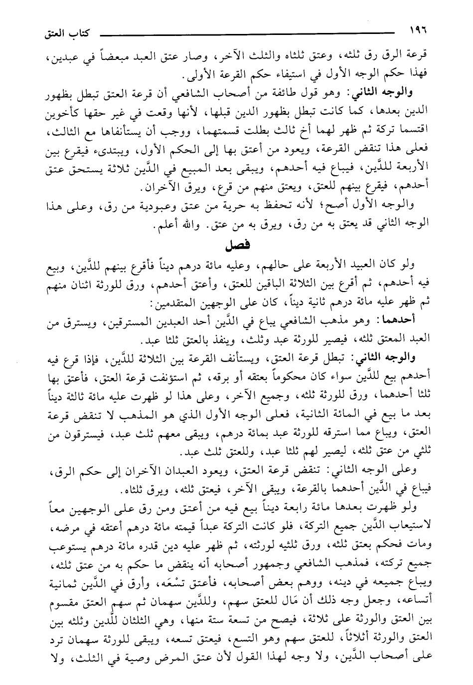 ولو ظهرت بعدها مائة رابعة دينًا بيع فيه من أعتق ومن رق على الوجهين معًا لاستيعاب الدين جميع التركة، فلو كانت التركة عبدًا قيمته مائة درهم أعتقه في مرضه، ومات فحكم بعتق ثلثه، ورق ثلثيه لورثته، ثم ظهر عليه دين قدره مائة درهم يستوعب جميع تركته، فمذهب الشافعي وجمهور أصحابه أنه ينقض ما حكم به من عتق ثلثه، ويباع جميعه في دينه، ووهم بعض أصحابه، فأعتق تسعه، وأرق في الدين ثمانية اتساعه، وجعل وجه ذلك أن مال للعتق سهم، وللدين سهمان ثم سهم العتق مقسوم بين العتق والورثة على ثلاثة، فيصح من تسعة ستة منها، وهي الثلثان للدين وثلثه بين العتق والورثة أثلاثًا، للعتق سهم وهو التسع، فيعتق تسعة، ويبقي للورثة سهمان ترد على أصحاب الدين، ولا وجه لهذا القول لأن عتق المرض وصية في الثلث، ولا