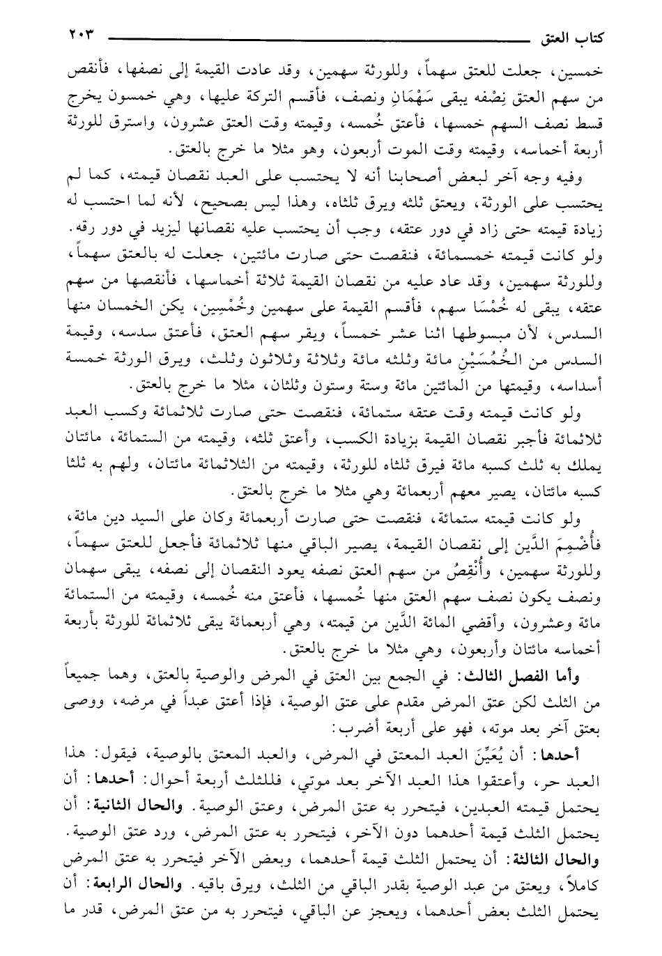 أحدها: أن يعين العبد المعتق في المرض، والعبد المعتق بالوصية، فيقول: هذا العبد حر، وأعتقوا هذا العبد الآخر بعد موتي، فللثلث أربعة أحوال: أحدها: أن يحتمل قيمته العبدين، فيتحرر به عتق المرض، وعتق الوصية. والحال الثانية: ان يحتمل الثلث قيمة أحدهما دون الآخر، فيتحرر به عتق المرض، ورد عتق الوصية. والحال الثالثة: أن يحتمل الثلث قيمة أحدهما، وبعض الآخر فيتحرر به عتق المرض كاملًا، ويعتق من عبد الوصية بقدر الباقي من الثلث، ويرق باقيه. والحال الرابعة: أن يحتمل الثلث بعض أحدهما، ويعجز عن الباقي، فيتحرر به من عتق المرض، قدر ما
