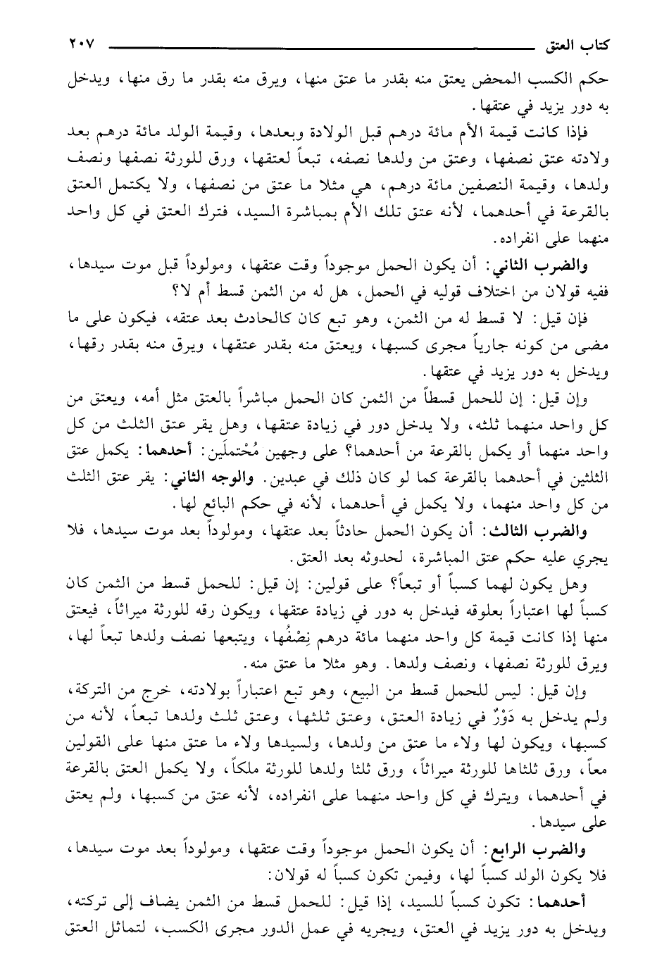 فإذا كانت قيمة الأم مائة درهم قبل الولادة وبعدها، وقيمة الولد مائة درهم بعد ولادته عتق نصفها، وعتق من ولدها نصفه، تبعًا لعتقها، ورق للورثة نصفها ونصف ولدها، وقيمة النصفين مائة درهم، هي مثلًا ما عتق من نصفها، ولا يكتمل العتق بالقرعة في أحدهما، لأنه عتق تلك الأم بمباشرة السيد، فترك العتق في كل واحد منهما على انفراده.