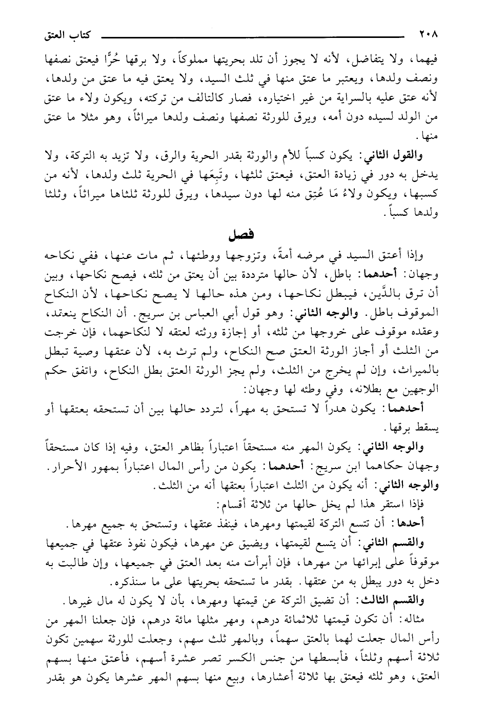 والقول الثاني: يكون كسبًا للأم والورثة بقدر الحرية والرق، ولا تزيد به التركة، ولا يدخل به دور في زيادة العتق، فيعتق ثلثها، وتبعها في الحرية ثلث ولدها، لأنه من كسبها، ويكون ولاء ما عتق منه لها دون سيدها، ويرق للورثة ثلثاها ميراثًا، وثلثا ولدها كسبًا.