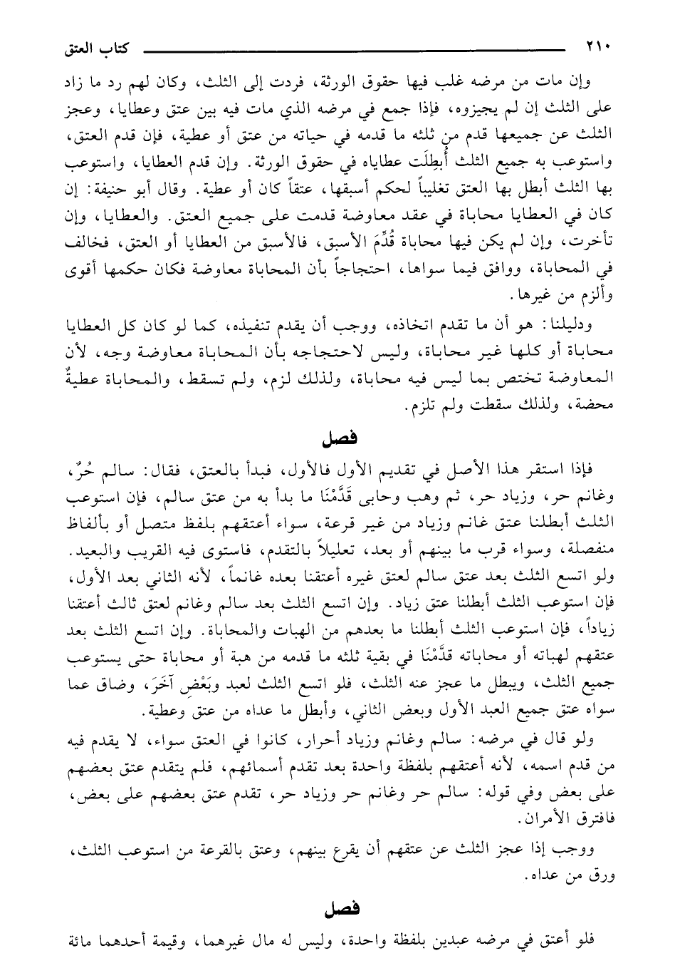 فإذا استقر هذا الأصل في تقديم الأول فالأول، فبدأ بالعتق، فقال: سالم حر، وغانم حر، وزياد حر، ثم وهب وحابى قدمنا ما بدأ به من عتق سالم، فإن استوعب الثلث أبطلنا عتق غانم وزيادة من غير قرعة، سواء أعتقهم بلفظ متصل أو بألفاظ منفصلة، وسواء قرب ما بينهم أو بعد، تعليلا بالتقدم، فاستوى فيه القريب والبعيد. ولو اتسع الثلث بعد عتق سالم لعتق غيره أعتقنا بعده غانما، لأنه الثاني بعد الأول، فإن استوعب الثلث أبطلنا ما بعدهم من الهبات والمحاباة. وإن اتسع الثلث بعد عتقهم لهباته أو محاباته قدمنا في بقية ثلثه ما قدمه من هبة أو محاباة حتى يستوعب جميع الثلث، ويبطل ما عجز عنه الثلث، فلو اتسع الثلث لعبد وبعض آخر، وضاق عما سواه عتق جميع العبد الأول وبعض الثاني، وأبطل ما عداه من عتق وعطية.