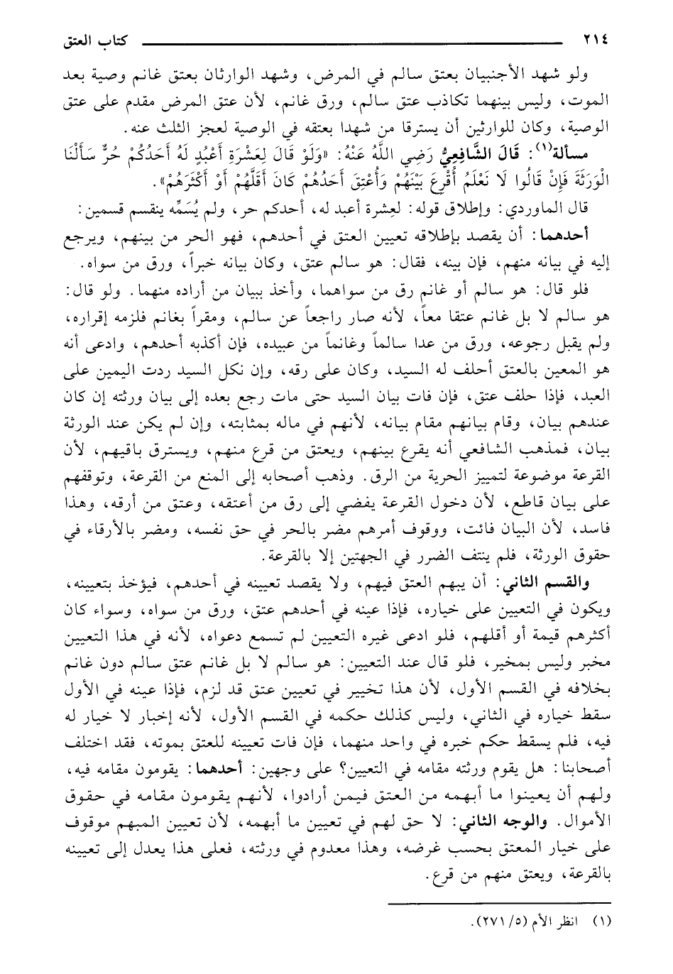 والقسم الثاني: أن يبهم العتق فيهم، ولا يقصد تعيينه في أحدهم، فيؤخذ بتعيينه، ويكون في التعيين على خياره، فإذا عينه في أحدهم عتق، ورق من سواه، وسواء كان أكثرهم قيمة أو أقلهم، فلو ادعى غيره التعيين لم تسمع دعواه، لنه في هذا التعيين مخبر وليس بمخير، فلو قال عند التعيين: هو سالم لا بل غانم عتق سالم دون غانم بخلافه في القسم الأول، لأن هذا تخيير في تعيين عتق قد لزم، فإذا عينه في الأول سقط خياره في الثاني، وليس كذلك حكمه في القسم الأول، لأنه إخبار لا خيار له فيه، فلم يسقط حكم خبره في واحد منهما، فإن فات تعيينه للعتق بموته، فقد اختلف أصحابنا: هل يقوم ورثته مقامه في التعيين؟ على وجهين: أحدهما: يقومون مقامه فيه، ولهم أن يعينوا ما أبهمه من العتق فيمن أرادوا، لأنهم يقومون مقامه في حقوق الأموال. والوج الثاني: لا حق لهم في تعيين ما أبهمه، لأن تعيين المبهم موقوف على خيار المعتق بحسب غرضه، وهذا معدوم في ورثته، فعلى هذا يعدل إلى تعيينه بالقرعة، ويعتق منهم من قرع.