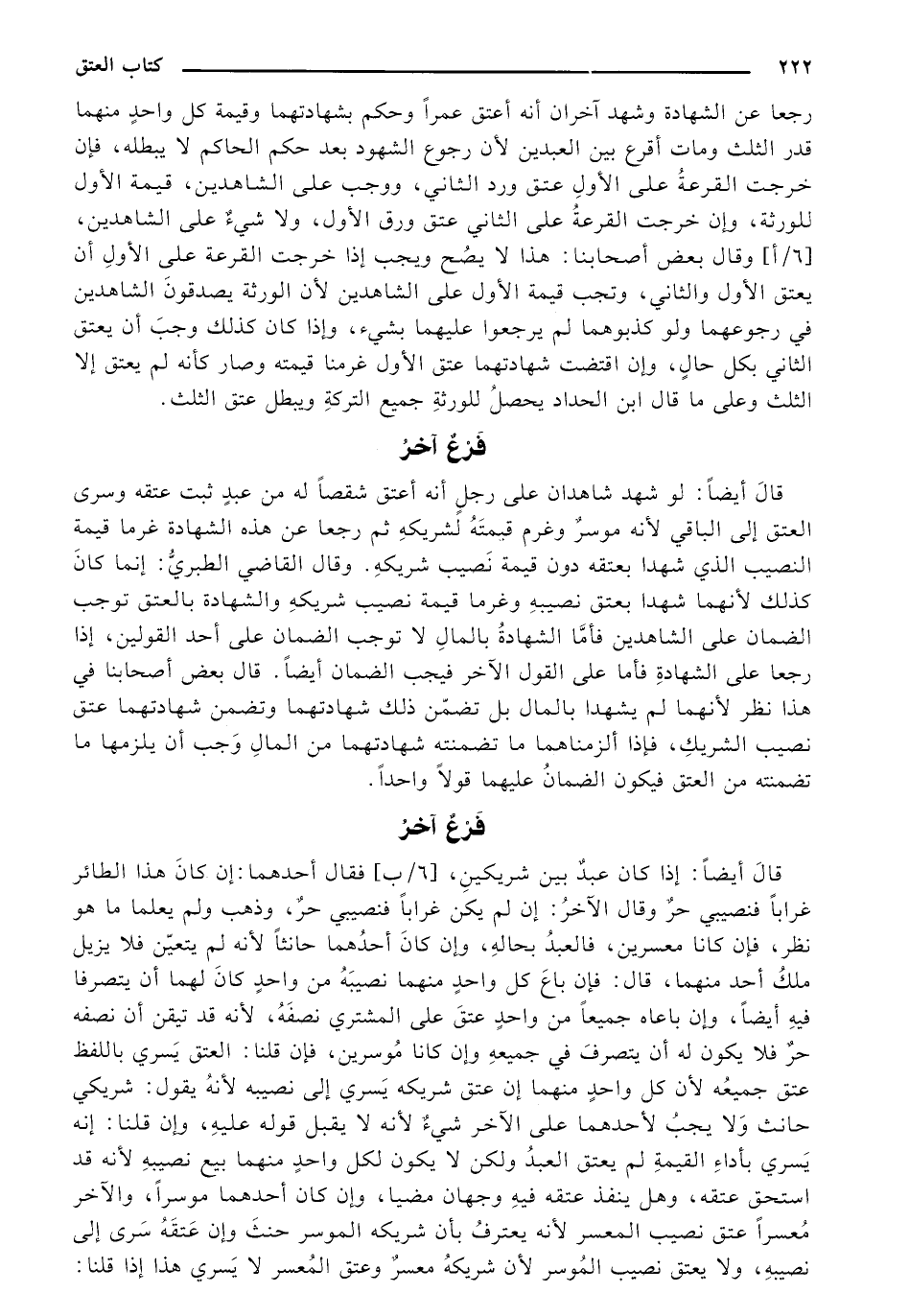 قال أيضا: لو شهد شاهدان على رجل أنه أعتق شقصا له من عبد ثبت عتقه وسرى العتق إلى الباقي لأنه موسر وغرم قيمته لشريكه ثم رجعا عن هذه الشهادة غرما قيمة النصيب الذي شهدا بعتقه دون قيمة نصيب شريكه. وقال القاضي الطبري: إنما كان كذلك لأنهما شهدا بعتق نصيبه وغرما قيمة نصيب شريكه والشهادة بالعتق توجب الضمان على الشاهدين فأما الشهادة بالمال لا توجب الضمان على أحد القولين، إذا رجعا على الشهادة فأما على القول الآخر فيجب الضمان أيضا. قال بعض أصحابنا في هذا نظر لأنهما لم يشهدا بالمال بل تضمن ذلك شهادتهما وتضمن شهادتهما عتق نصيب الشريك، فإذا ألزمناهما ما تضمنته شهادتهما من المال وجب أن يلزمها ما تضمنته من العتق فيكون الضمان عليهما قولا واحدا.