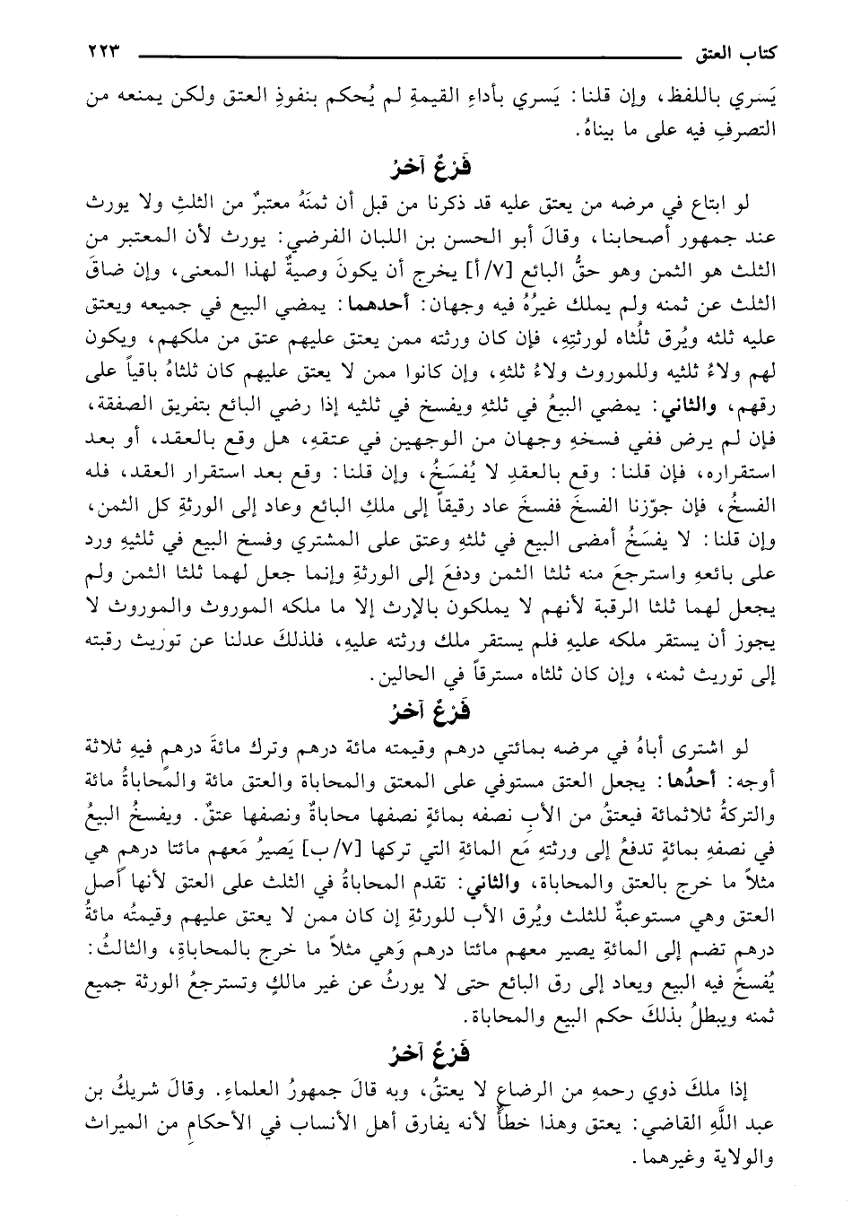 لو اشترى أباه في مرضه بمائتي درهم وقيمته مائة درهم وترك مائة درهم فيه ثلاثة أوجه: أحدهما: يجعل العتق مستوفي على المعتق والمحاباة والعتق مائة والمحاباة مائة والتركة ثلاثمائة فيعتق من الأب نصفه بمائة نصفها محاباة ونصفها عتق. ويفسخ البيع في نصفه بمائة تدفع إلى ورثته مع المائة التي تركها [7/ ب] يصير معهم مائتا درهم هي مثلا ما خرج بالعتق والمحاباة، والثاني: تقدم المحاباة في الثلث على العتق لأنها أصل العتق وهي مستوعبة للثلث ويرق الأب للورثة إن كان ممن لا يعتق عليهم وقيمته مائة درهم تضم إلى المائة يصير معهم مائتا درهم وهي مثلا ما خرج بالمحاباة، والثالث: يفسخ فيه البيع ويعاد إلى رق البائع حتى لا يورث عن غير مالك وتسترجع الورثة جميع ثمنه ويبطل بذلك حكم البيع والمحاباة.
